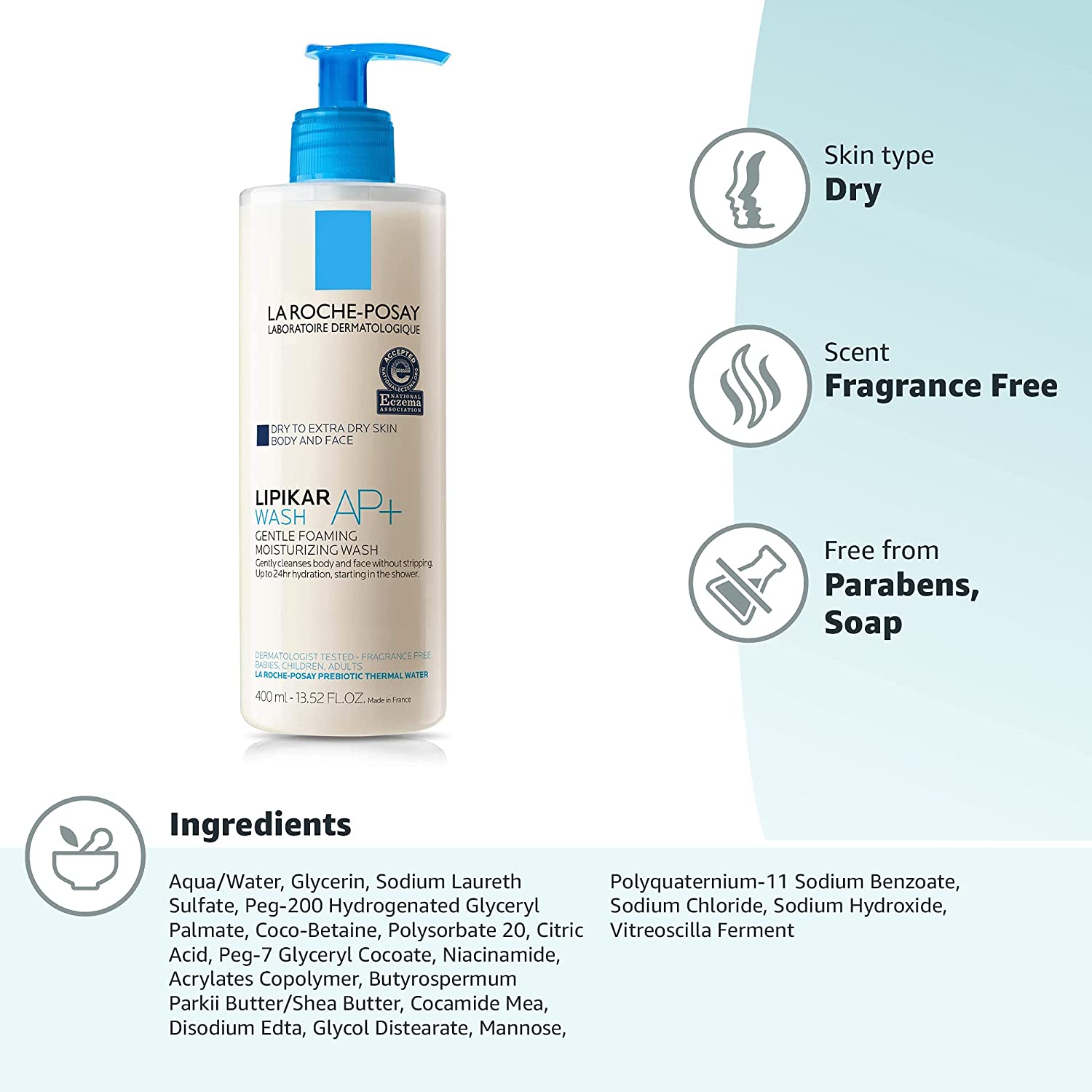 La Roche Posay Lipikar Wash AP+ Body & Face Wash with Pump, Gentle Daily Cleanser with Shea Butter & Niacinamide for Extra Dry Skin, Allergy Tested