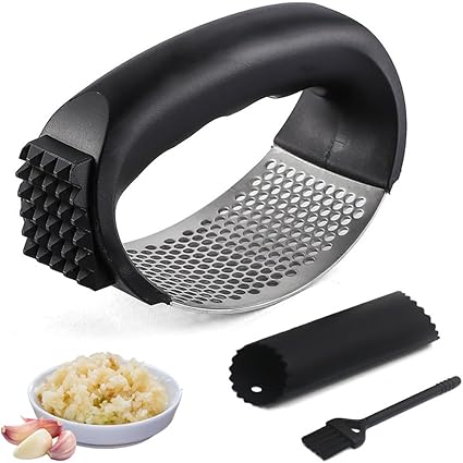 Stainless Steel Garlic Press, 2024 New Garlic Crusher Stainless Steel Garlic Mincer Garlic Press Rocker, Garlic Rocker Mincer Garlic Masher Garlic Cutter Chopper with Brush Kitchen Tools (Black)