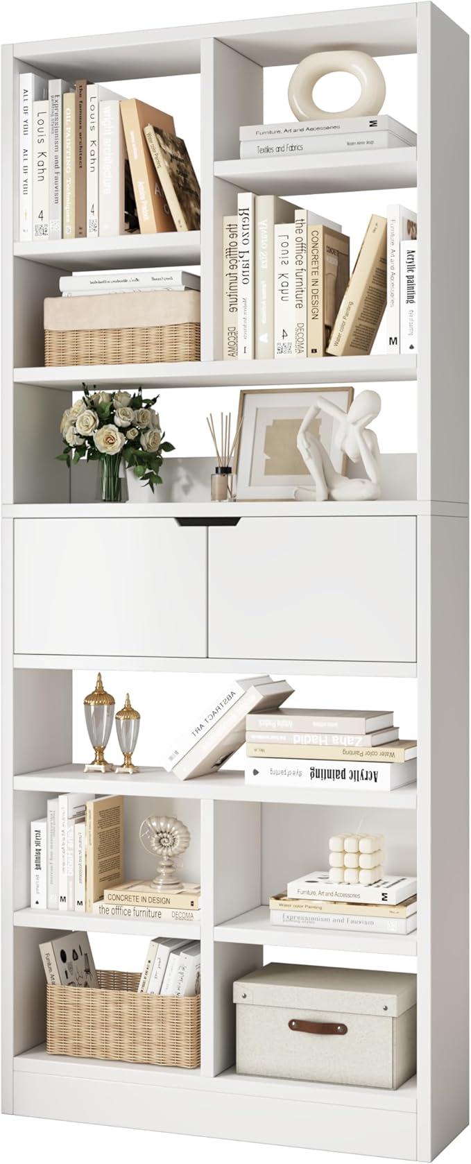 Bookshelf - Wooden Open Shelf Bookcase, 71" Tall Freestanding Display Storage Cabinet Organizer with 10 Cubes and Door, Floor Standing Bookshelf for Home Office, White