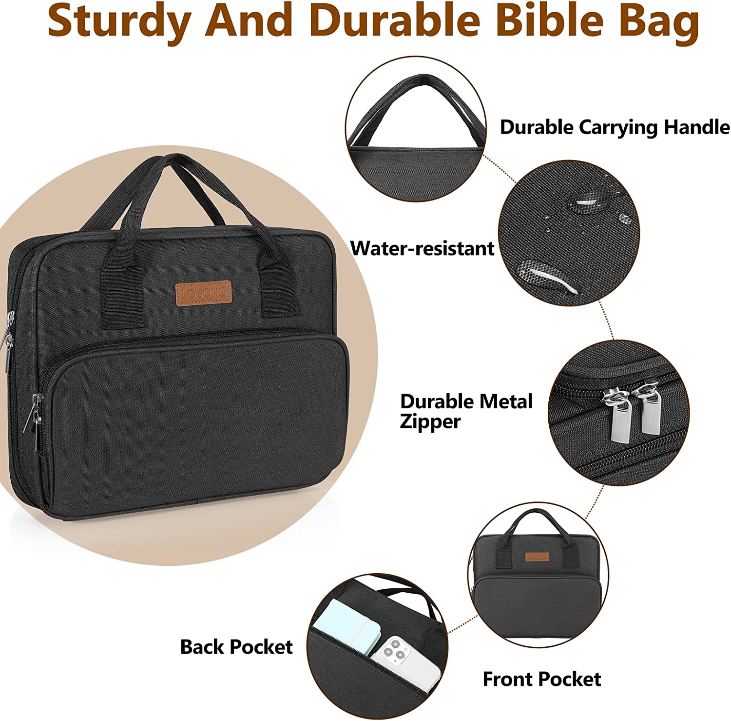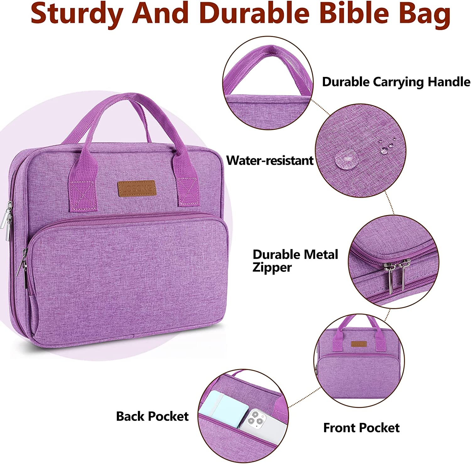 • DURABLE Material: High Quality: Bible covers are made of water-resistant polyester canvas and durable metal zipper. The reinforced hand strap on the Bible bag makes it easy to grasp and go. This bible carrying bag can protect your bible from scuffing.