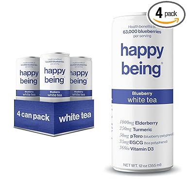 Happy Being Nutrient-Rich Organic Blueberry White Tea _ _ Infused with Turmeric, Elderberry, Vitamin D3, Caffeine Free, Plant-Based, Low Calorie & Low Sugar Drinks, 12oz (4 Pack)