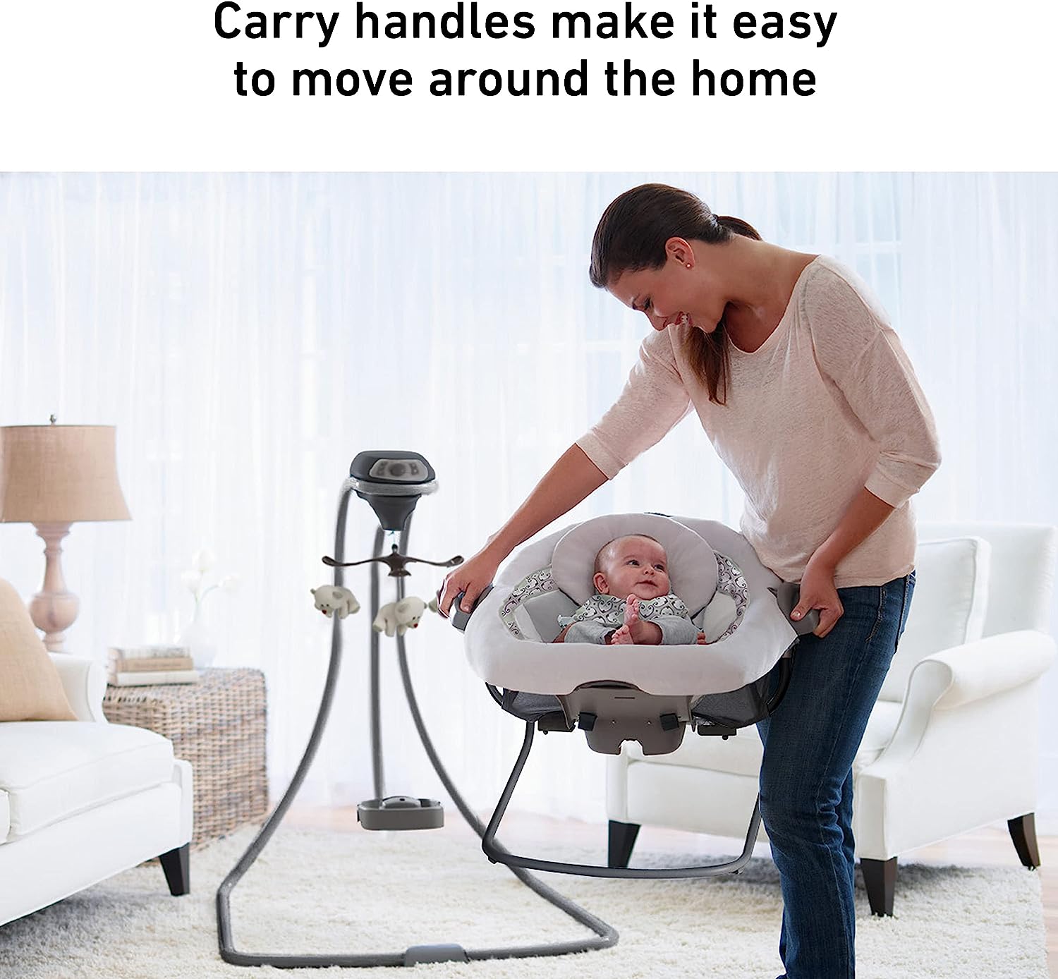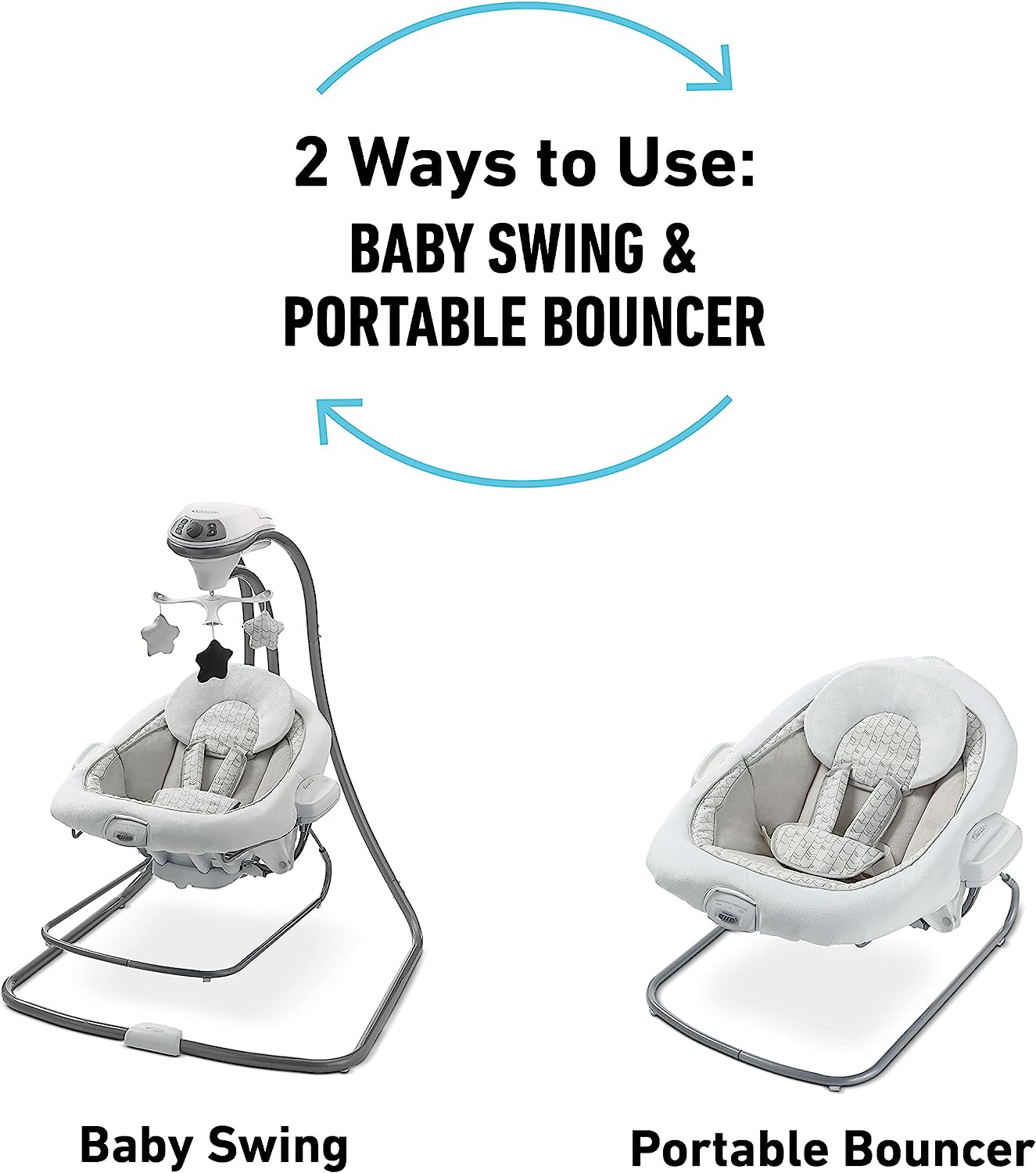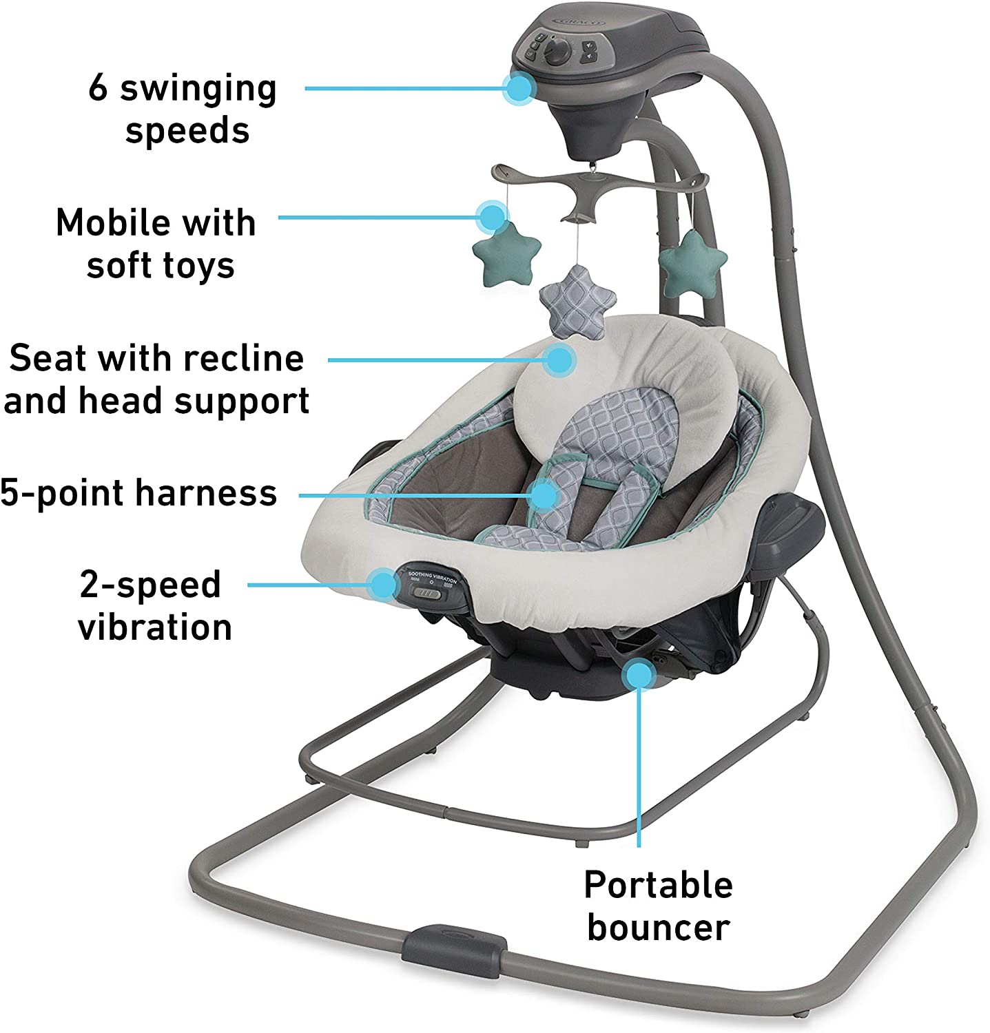 The Graco® DuetConnect® LX Swing and Bouncer features a swing seat that doubles as a portable bouncer with carry handles, giving you the flexibility to move around the house while keeping baby cozy and close by. With added features including 2-speed vibration, 6 swinging speeds, classical songs, and soothing sounds, the Graco DuetConnect® LX Swing and Bouncer has all the options baby will love.