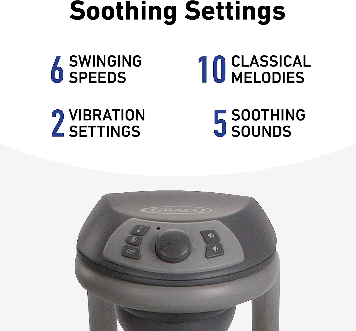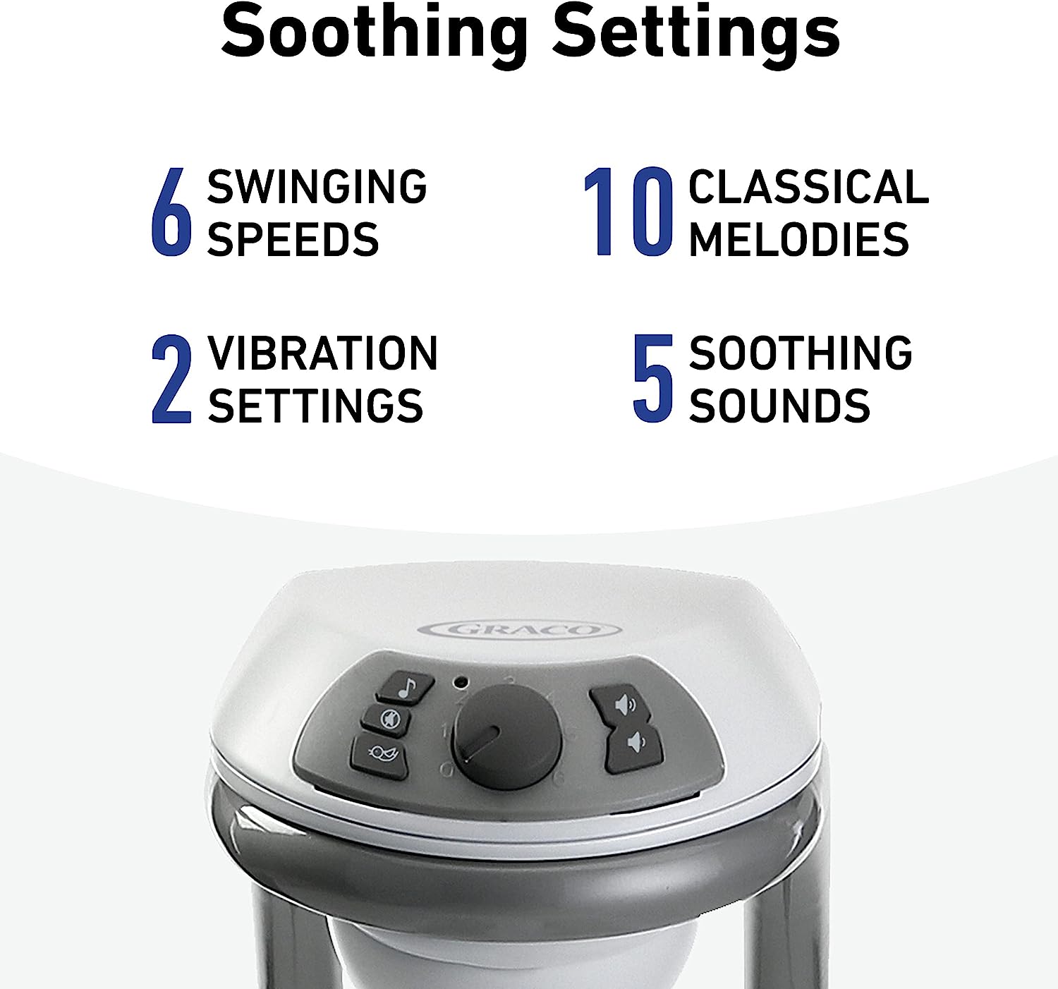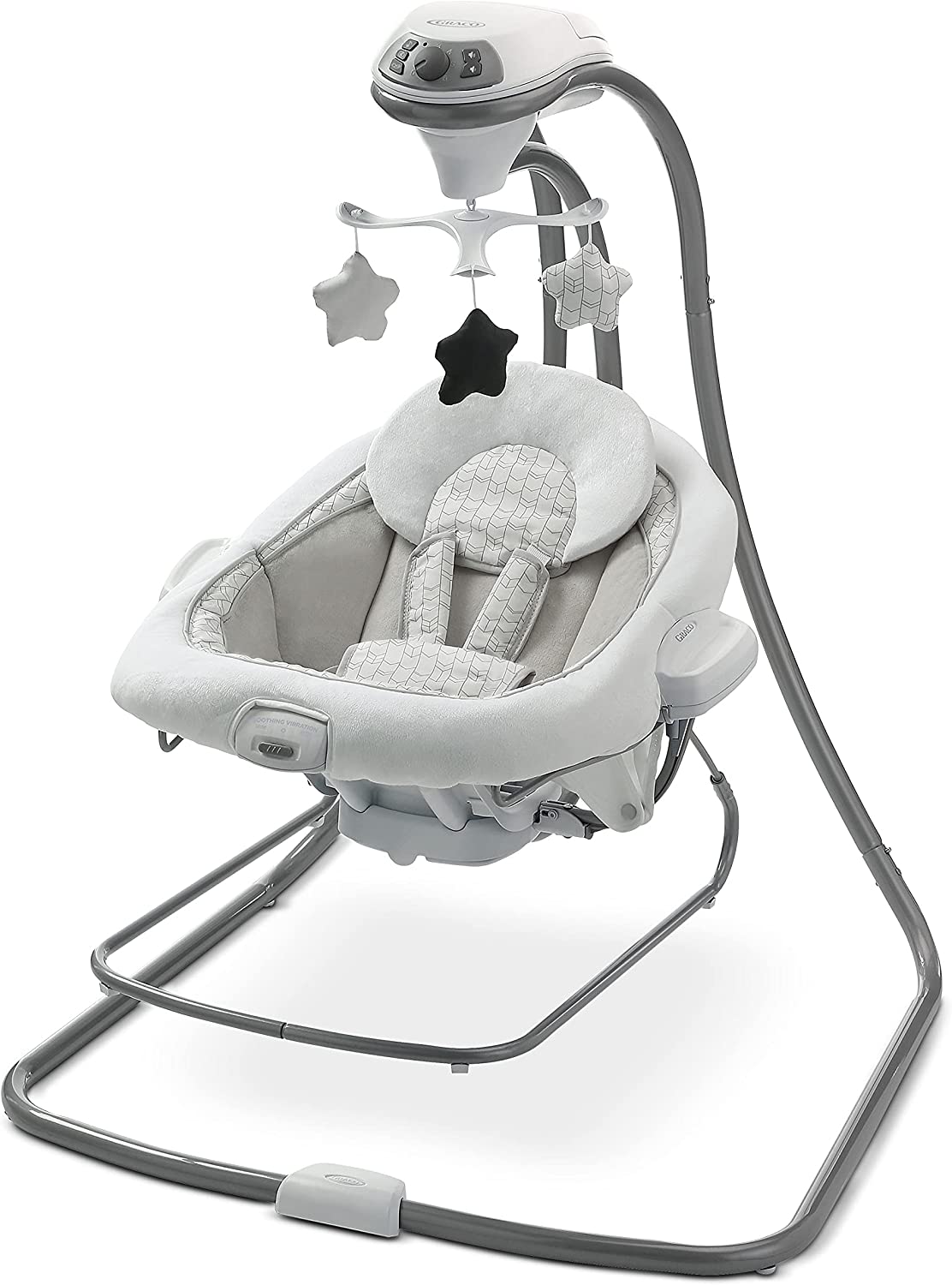 The Graco® DuetConnect® LX Swing and Bouncer features a swing seat that doubles as a portable bouncer with carry handles, giving you the flexibility to move around the house while keeping baby cozy and close by. With added features including 2-speed vibration, 6 swinging speeds, classical songs, and soothing sounds, the Graco DuetConnect® LX Swing and Bouncer has all the options baby will love.