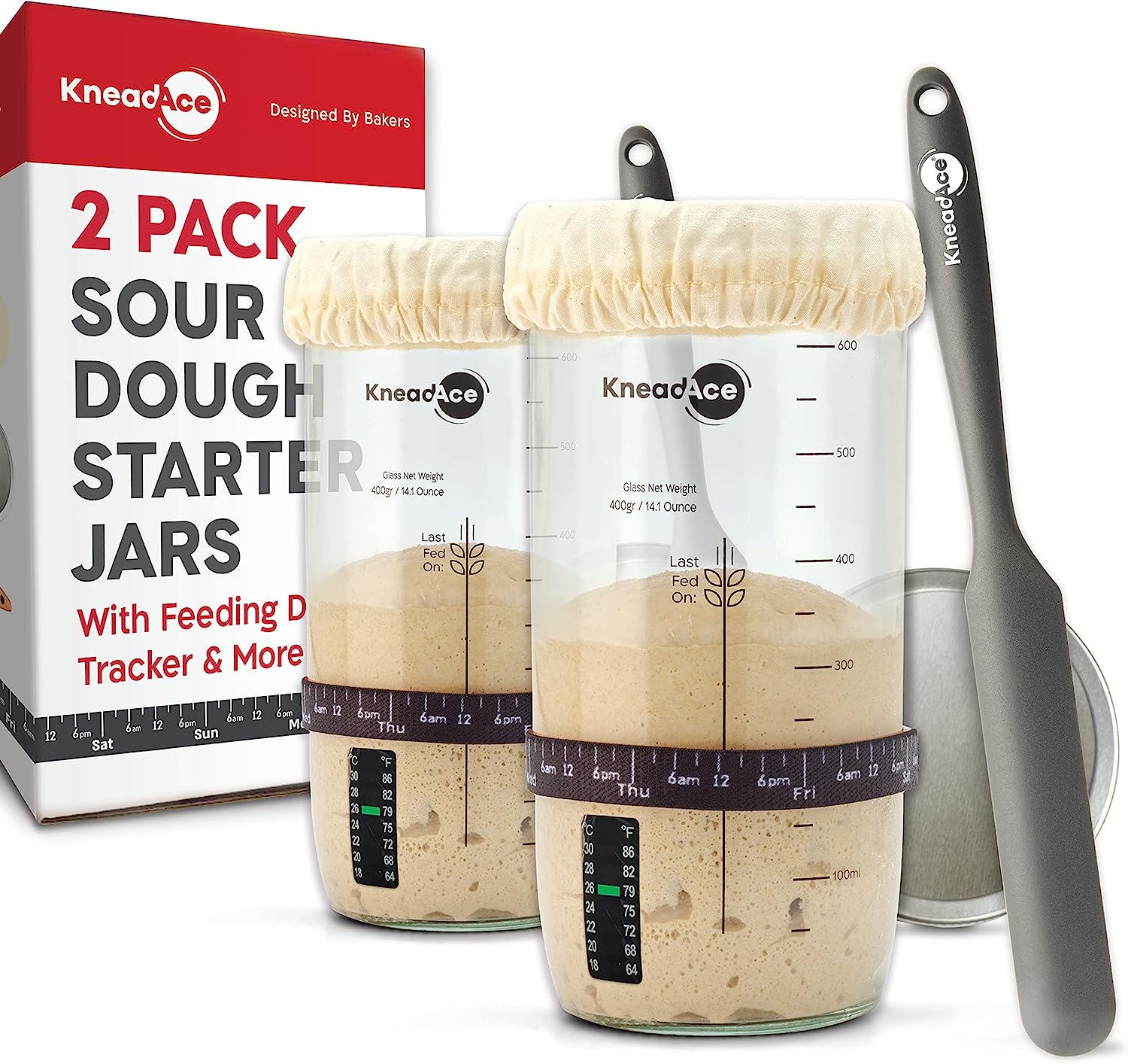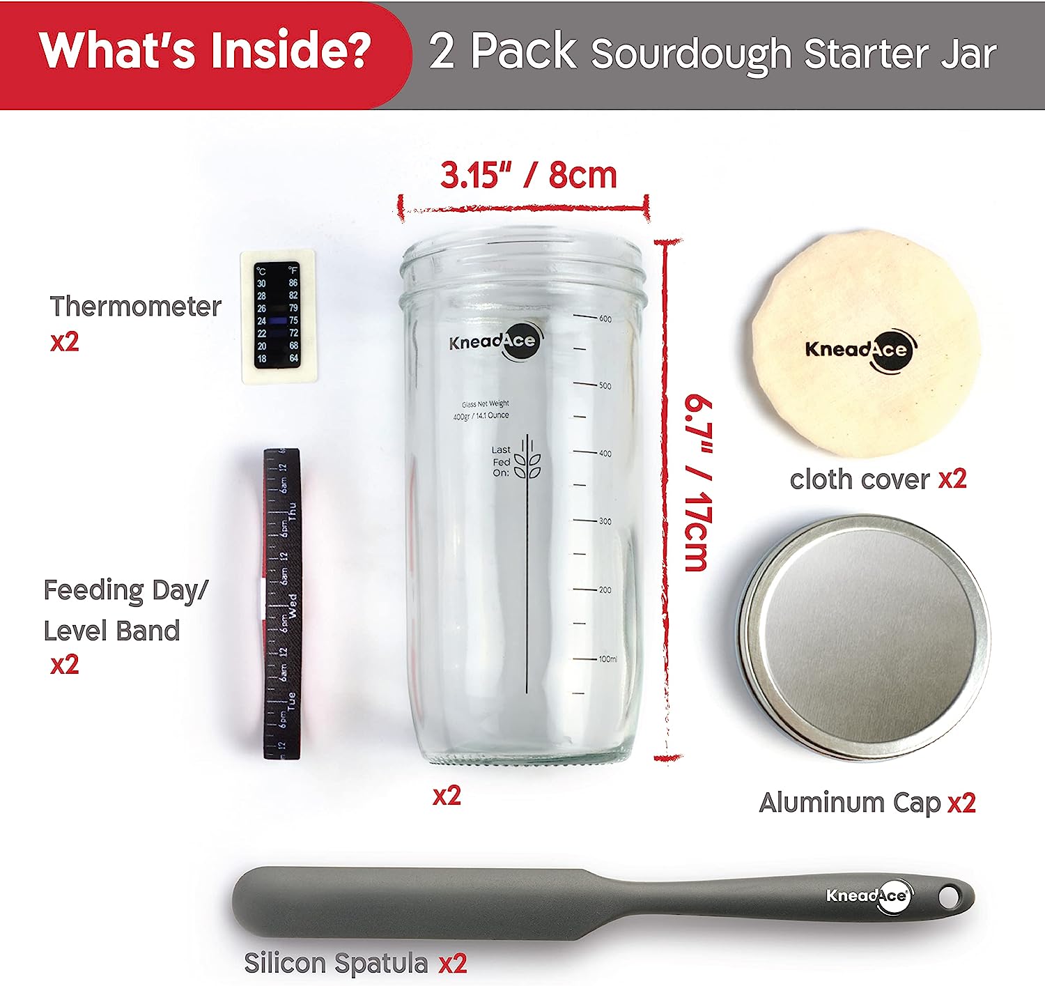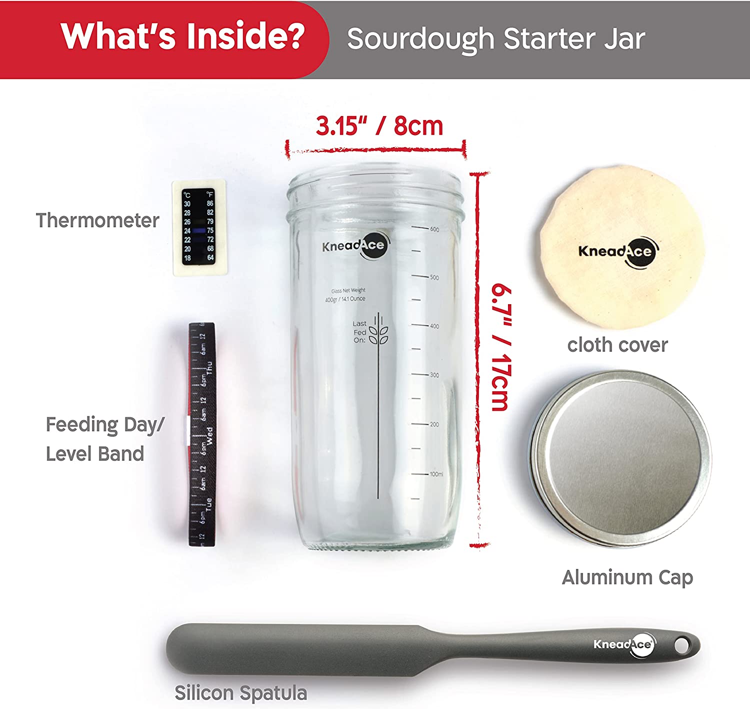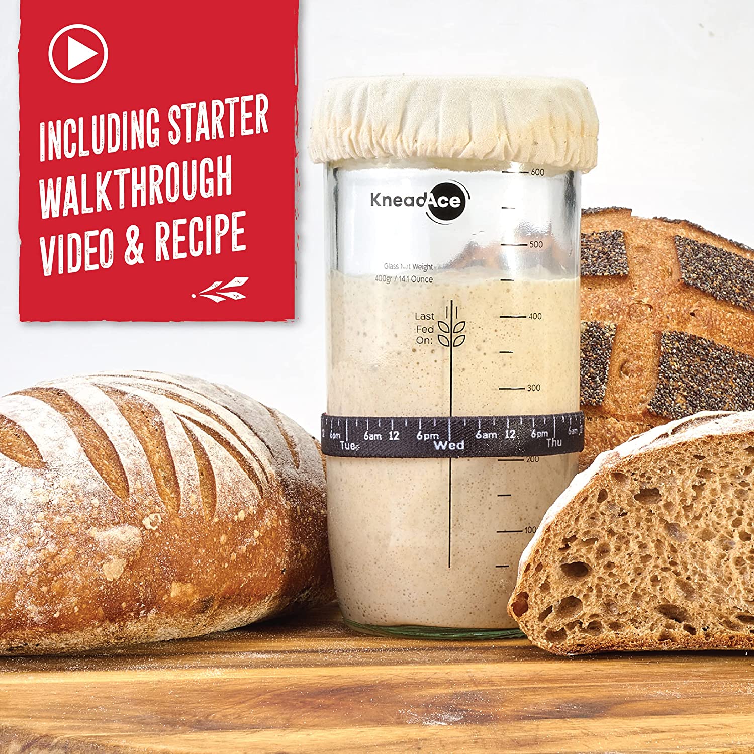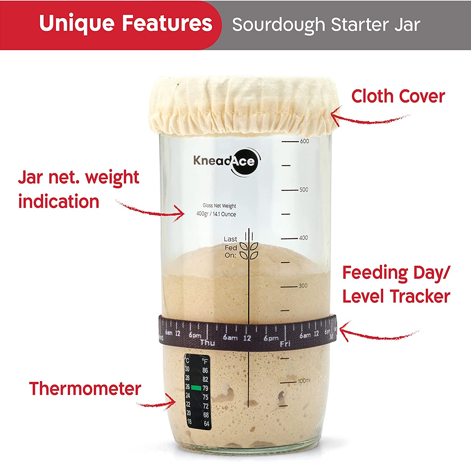 KneadAce Sourdough Starter Jar With Date Marked Feeding Band, Thermometer, Sourdough Fermentation Jar Scraper, Sewn Cloth Cover & Metal Lid, Sourdough Starter Kit (1 Pack)