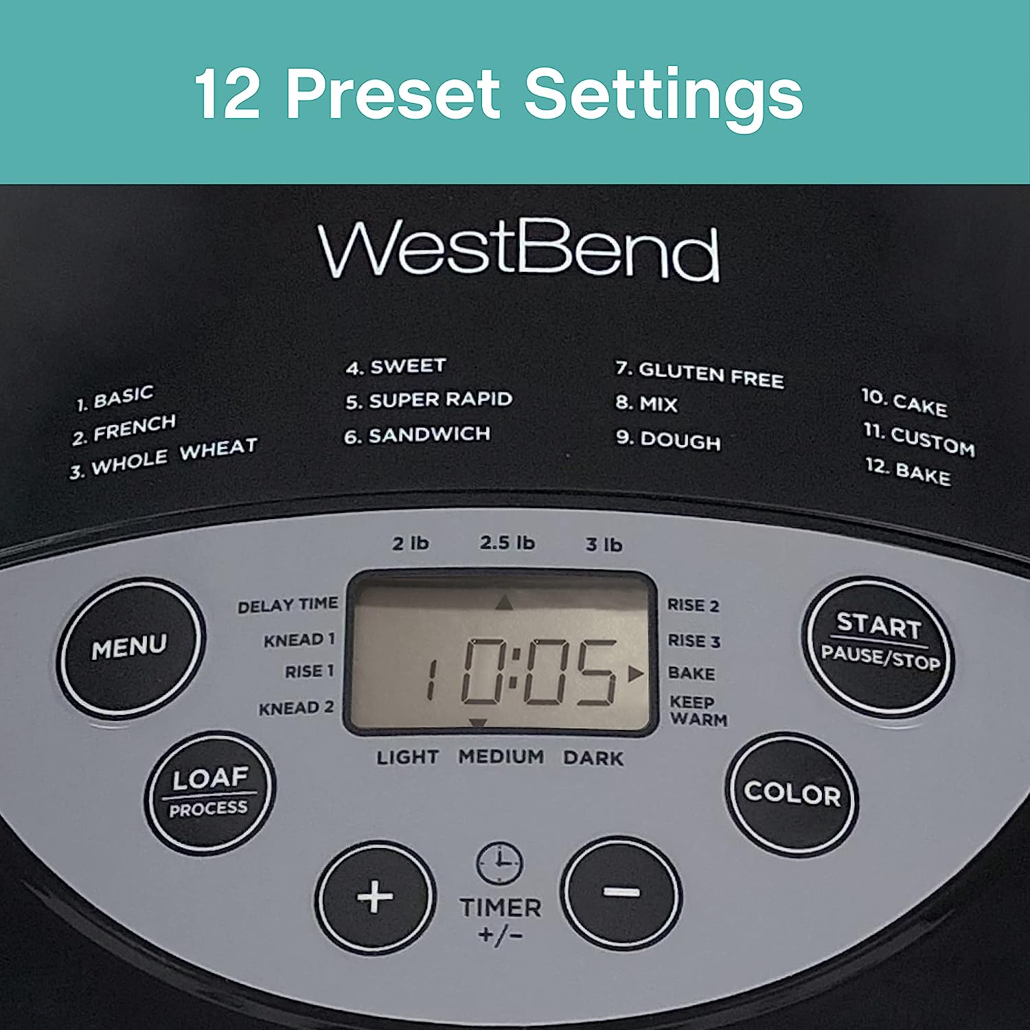• 12 digital settings include Basic, Wheat, French, Sweet, Dough, Gluten-Free, and Custom