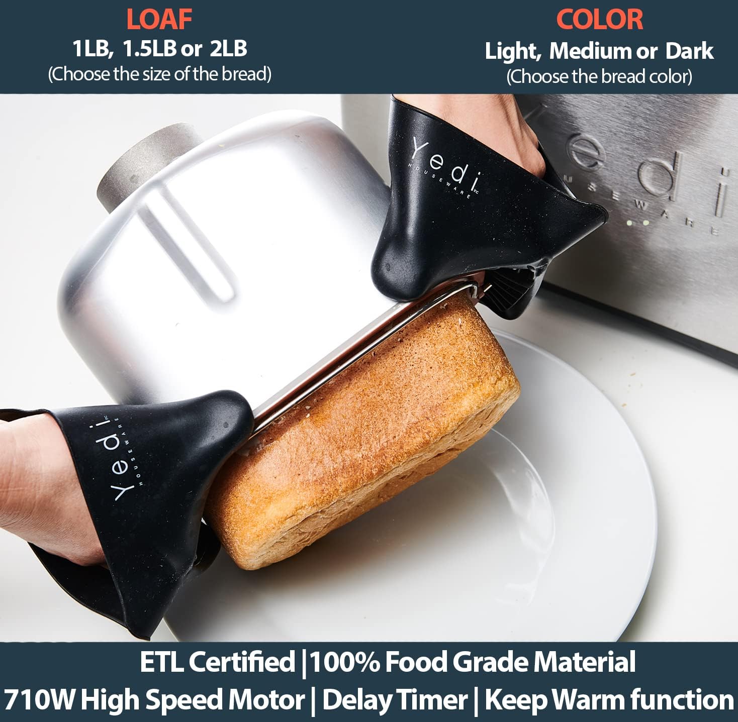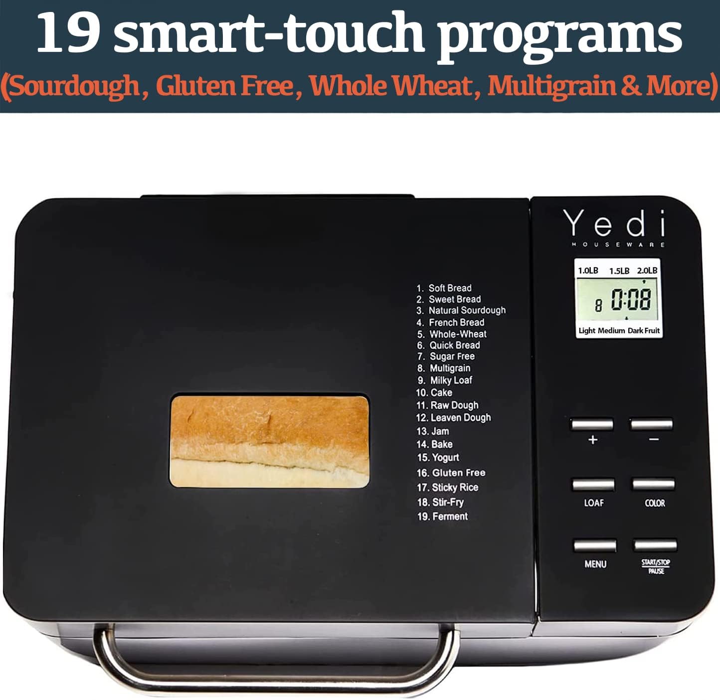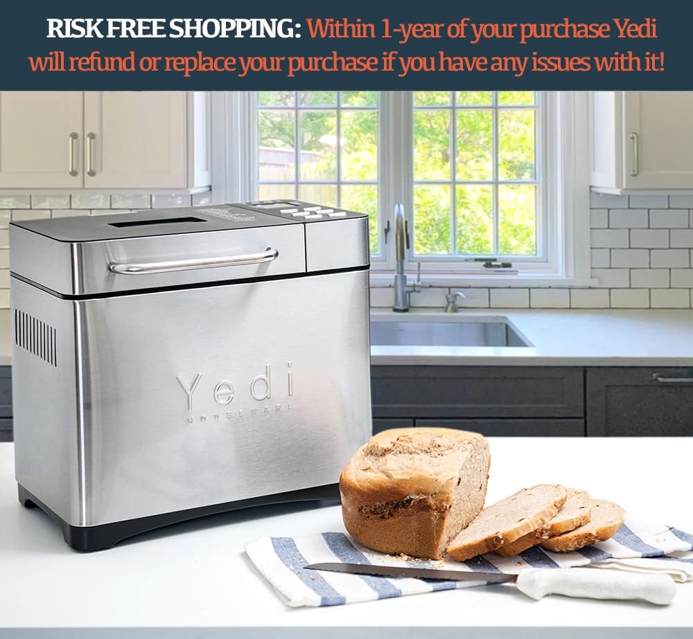 • EASY TO USE LCD DSIPLAY-SCREEN: Yedi’s ingenuity and innovative design provides an intuitive touch-pad control for extreme ease-of-use. Functions include, but are not limited to, a 15-hour Delay Timer, 1-Hour Automatic Keep Warm, 15-minute Power Interruption Recovery. The bottom line, FRESH bread anytime.