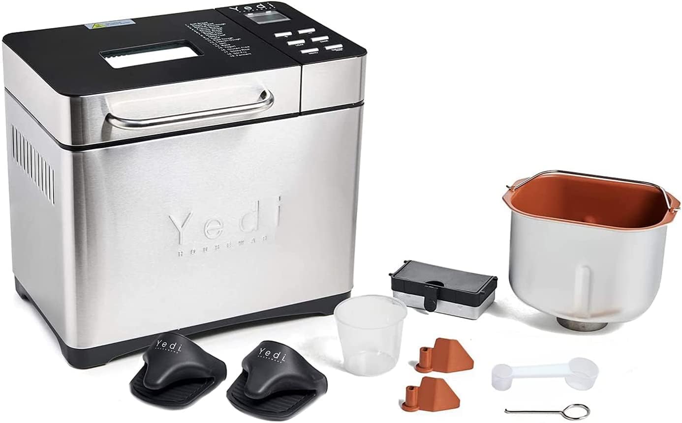 • TOTAL PACKAGE” ACCESSORIES & RECIPES INCLUDED: The Yedi “Total Package” Bread Machine comes fully equipped with every essential bread-making tool: Accessories include a measuring cup, measuring spoon, hook, silicone mitts, fruit/nut dispenser, and 2 stirring rods