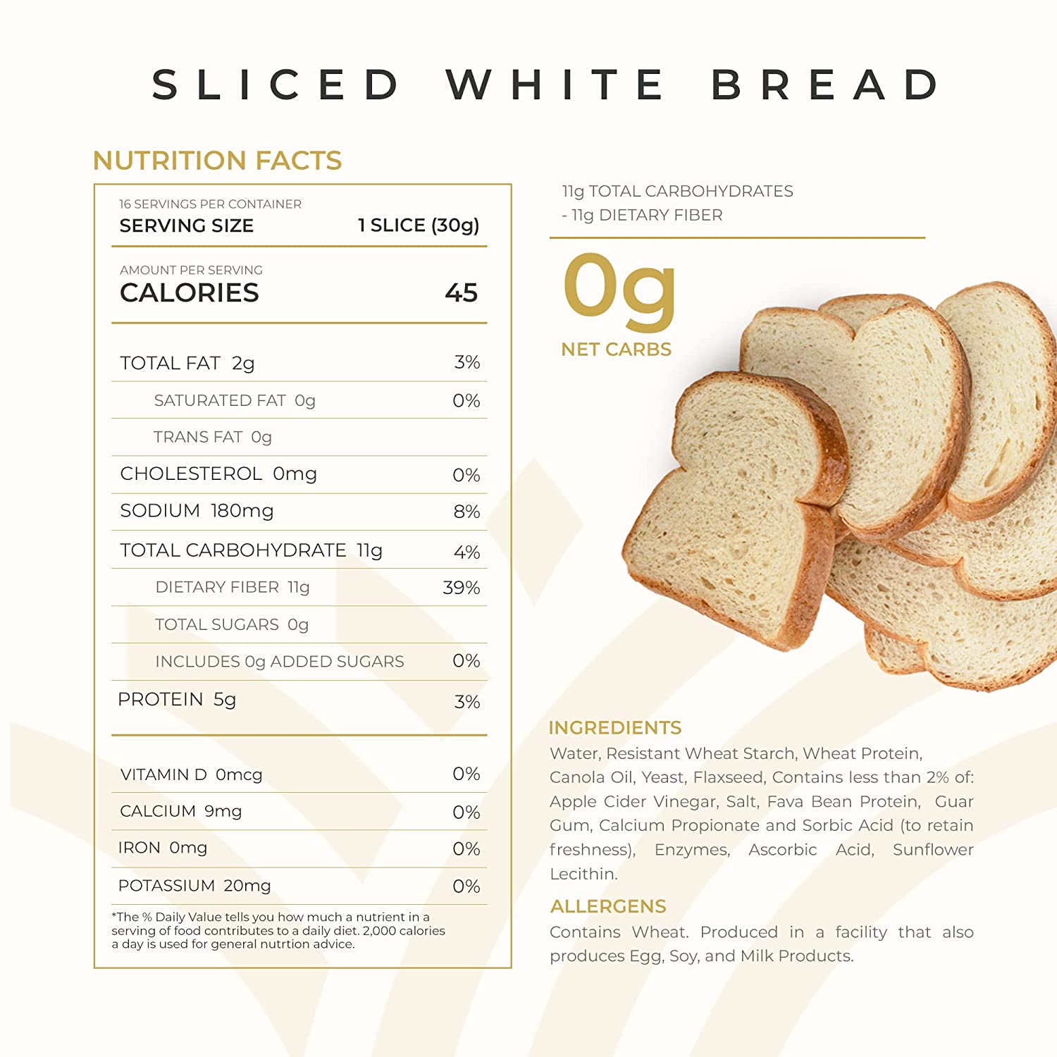 • DELICIOUS, TOO. 0g Net Carbs, 0g Sugar, 45 Calories per slice. Go ahead, reinvent your favorite sandwich or toast with our household favorite bread