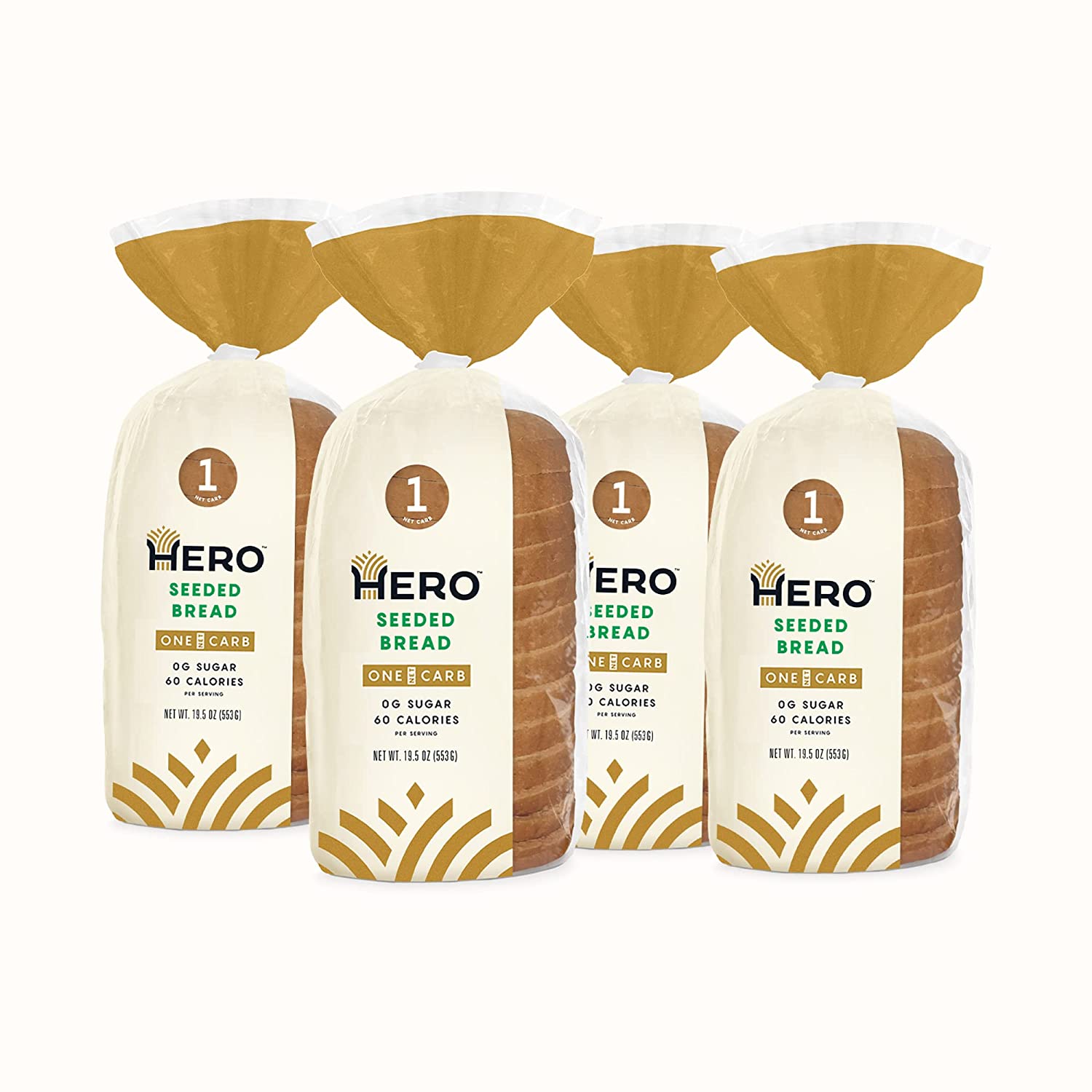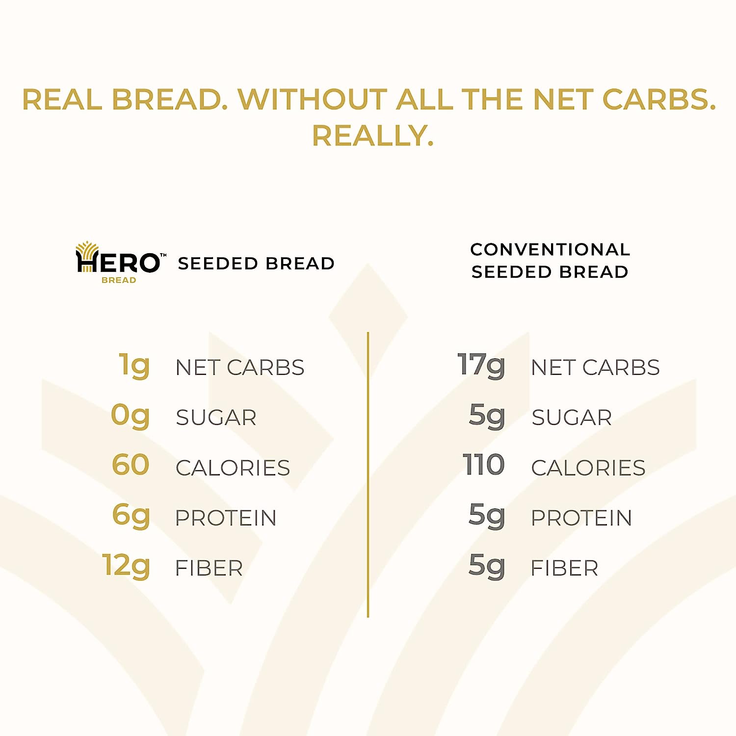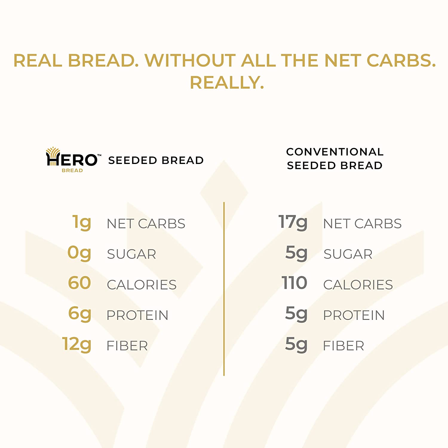 • HI, WE'RE HERO BREAD. At 1g net carb, 0g sugar and 60 calories per slice, Hero Seeded Bread is the feel-good pantry staple you've been searching for.