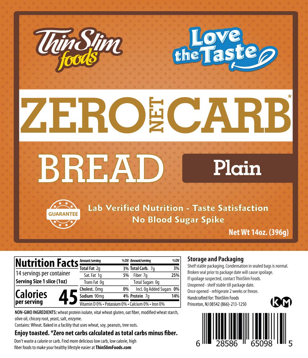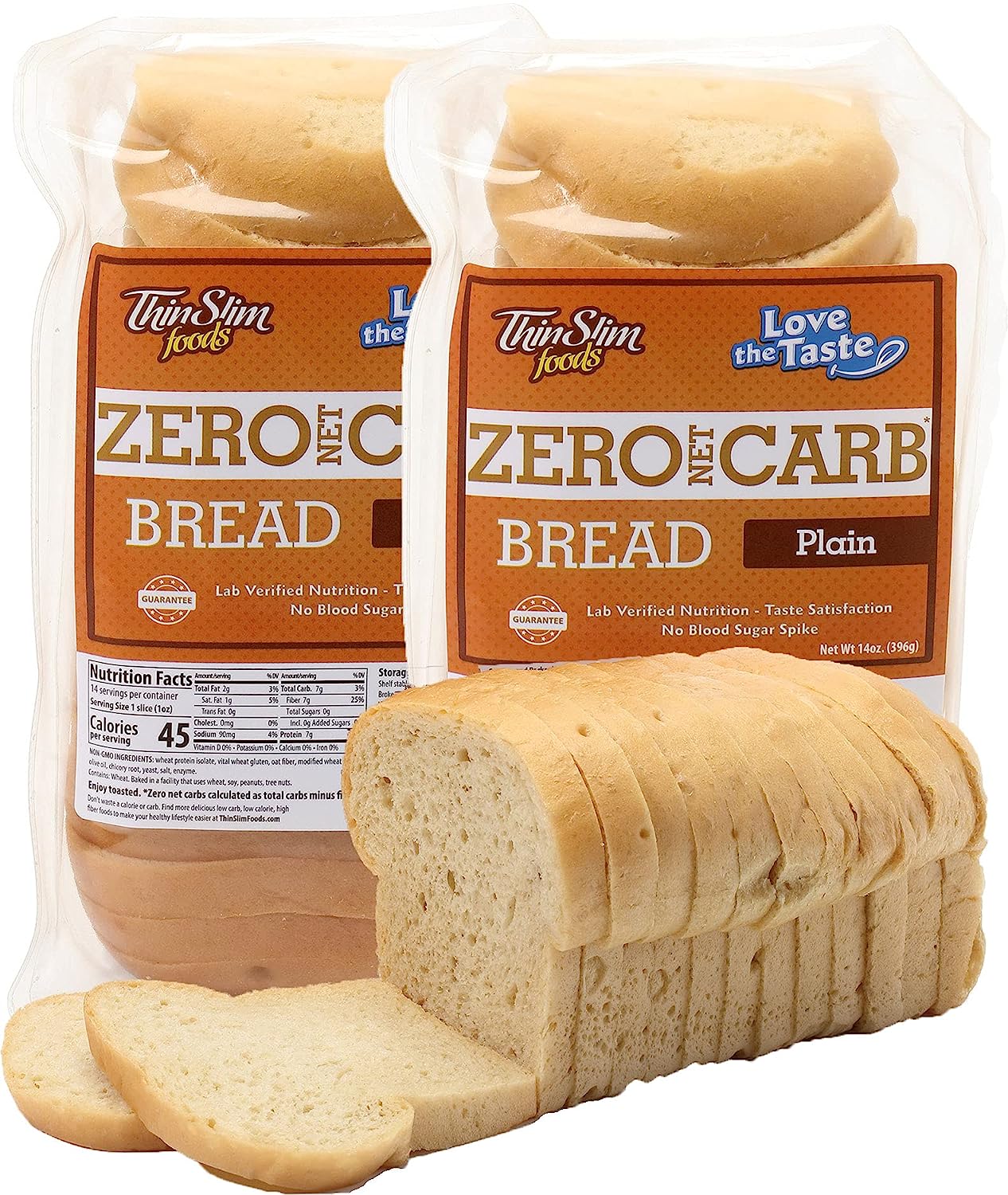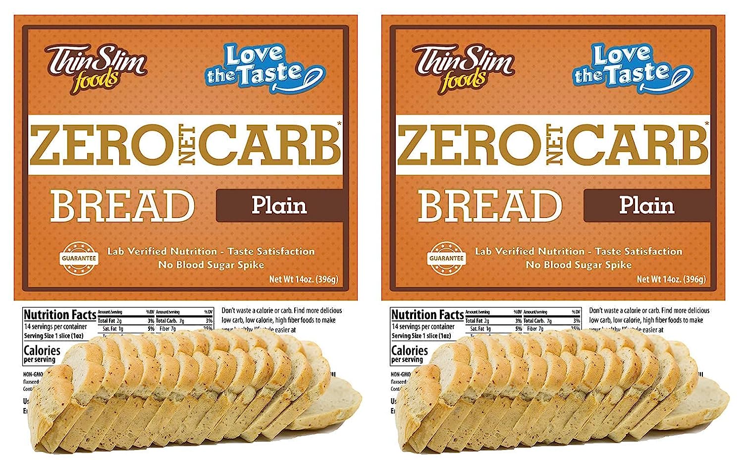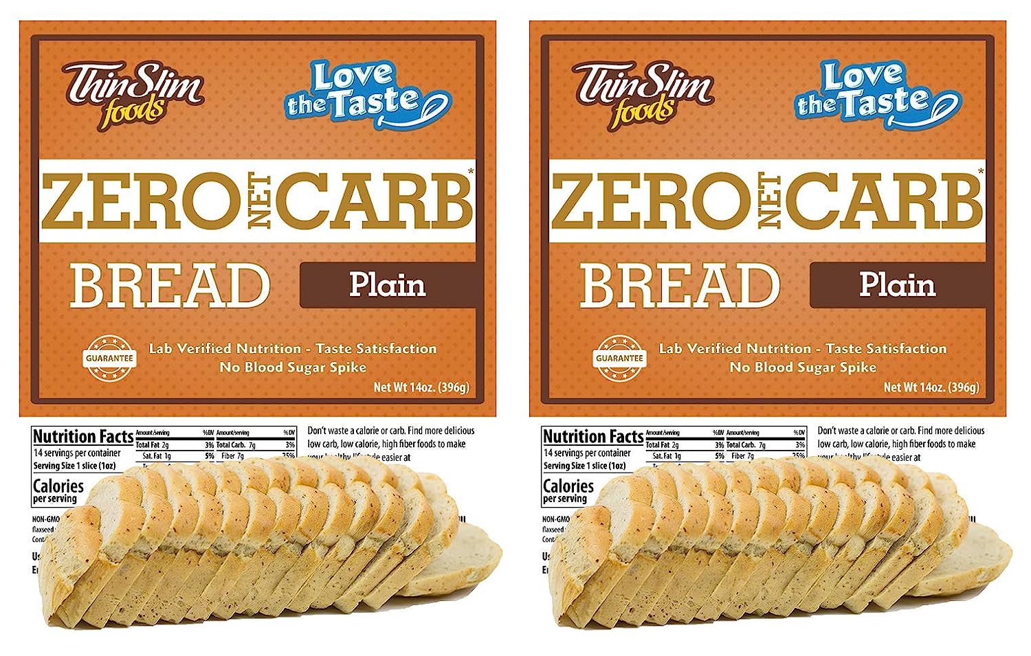 ThinSlim Foods Zero Net Carb Keto Bread is Low Carb Bread handcrafted with a revolutionary dough that has delighted the low carb consumer for over 10 years. This shelf-stable, keto-friendly bread is created with the highest quality ingredients, with zero net carbs and 45 calories per slice. This is a 2-pack of plain bread, with 14 slices per package. The ingredients used in our low-calorie loaf digest more slowly than normal bread, which means you stay satiated longer and your body doesn't turn the excess sugar into fat. This plain sliced bread is the ideal option for diabetics and dieters, including those on low carb plans or who are following Atkins, Keto, Paleo, Mediterranean, Whole30, Dukan, or South Beach diets. With 7g total carbohydrates and 7g of fiber in every slice, ThinSlim Foods zero net carb bread is proven to not cause a blood sugar spike. Our delicious, low GI sandwich bread has no soy or soybean oil, no almond flour, and our nutritional facts are independently lab-tested for accuracy. Our taste assurance: We're so confident that you'll love our products, that if you don't, let us know and we'll refund up to 1 of each flavor/type of product. Ingredients: wheat protein isolate, vital wheat gluten, oat fiber, modified wheat starch, olive oil, chicory root, yeast, salt, enzyme. Allergens: Contains wheat. Baked in a facility that uses wheat, soy, peanuts, tree nuts, eggs, and dairy. Storage: Unopened - Shelf stable till package date. Opened - Refrigerate 2 weeks or freeze.