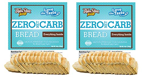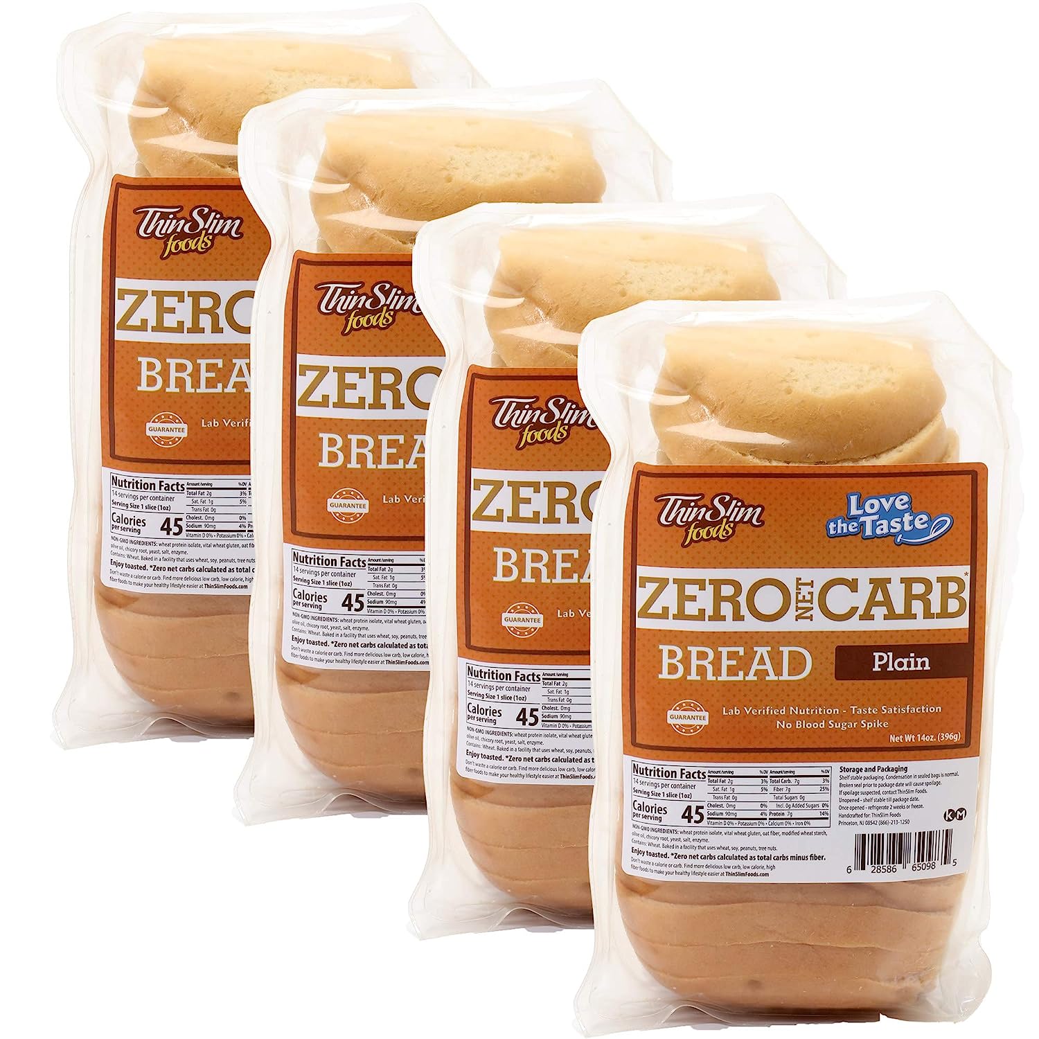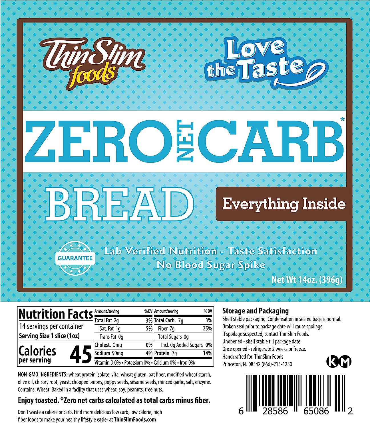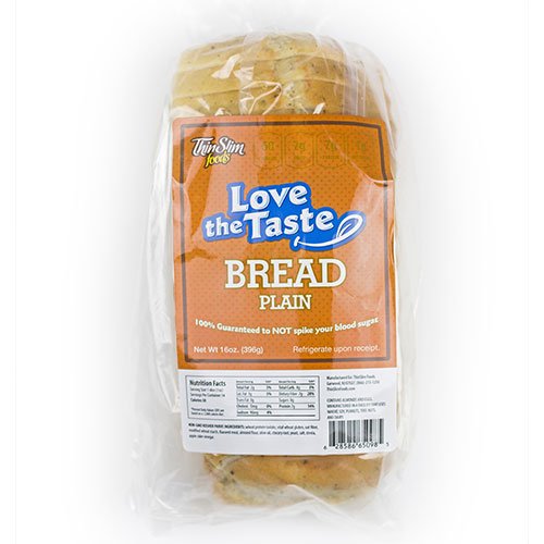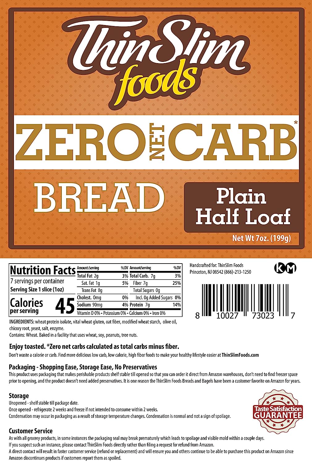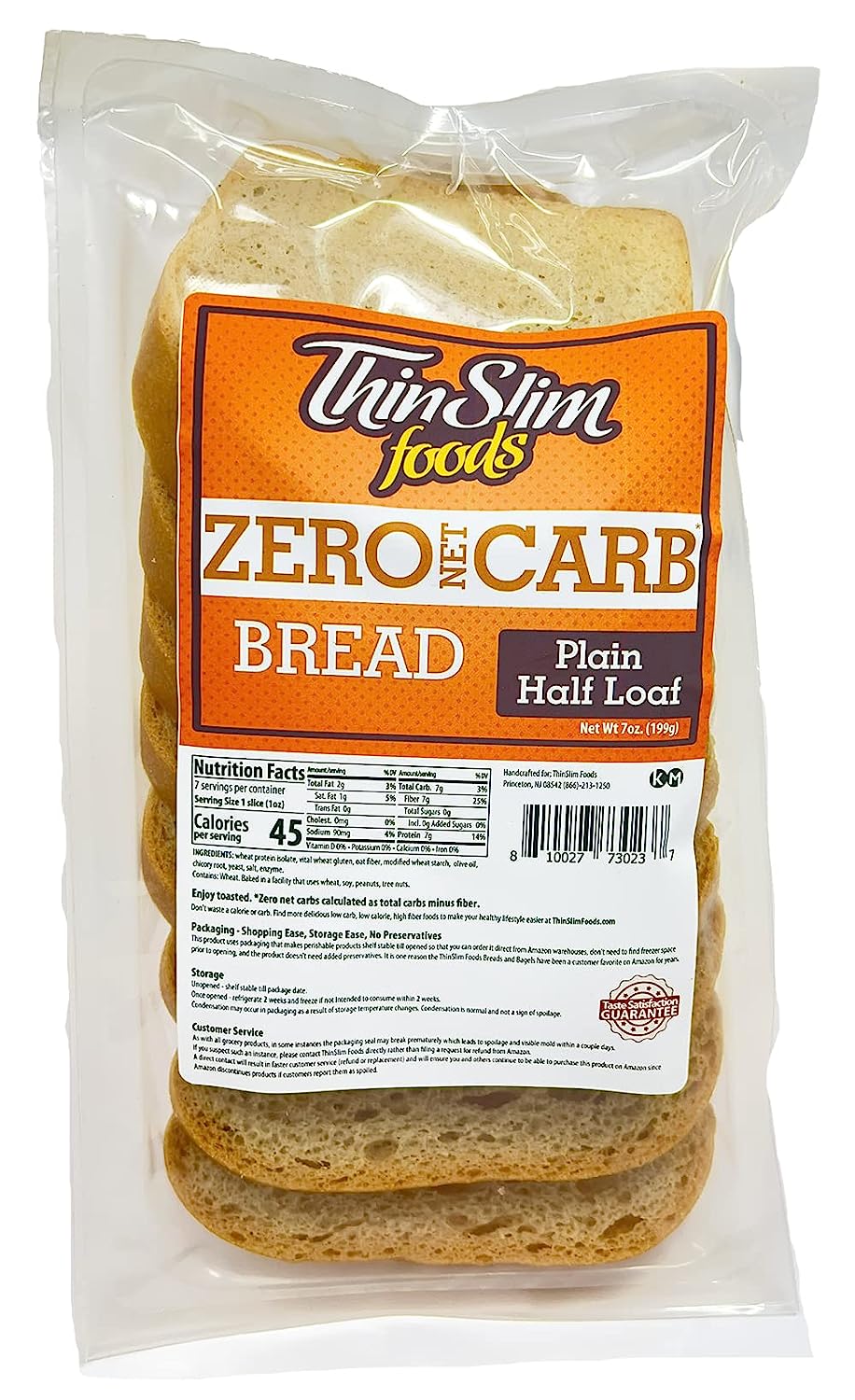 ThinSlim Foods Zero Net Carb Keto Bread is Low Carb Bread handcrafted with a revolutionary dough that has delighted the low carb consumer for over 10 years. This shelf-stable, keto-friendly bread is created with the highest quality ingredients, with zero net carbs and 45 calories per slice. This is a 2-pack of plain bread, with 14 slices per package. The ingredients used in our low-calorie loaf digest more slowly than normal bread, which means you stay satiated longer and your body doesn't turn the excess sugar into fat. This plain sliced bread is the ideal option for diabetics and dieters, including those on low carb plans or who are following Atkins, Keto, Paleo, Mediterranean, Whole30, Dukan, or South Beach diets. With 7g total carbohydrates and 7g of fiber in every slice, ThinSlim Foods zero net carb bread is proven to not cause a blood sugar spike. Our delicious, low GI sandwich bread has no soy or soybean oil, no almond flour, and our nutritional facts are independently lab-tested for accuracy. Our taste assurance: We're so confident that you'll love our products, that if you don't, let us know and we'll refund up to 1 of each flavor/type of product. Ingredients: wheat protein isolate, vital wheat gluten, oat fiber, modified wheat starch, olive oil, chicory root, yeast, salt, enzyme. Allergens: Contains wheat. Baked in a facility that uses wheat, soy, peanuts, tree nuts, eggs, and dairy. Storage: Unopened - Shelf stable till package date. Opened - Refrigerate 2 weeks or freeze.