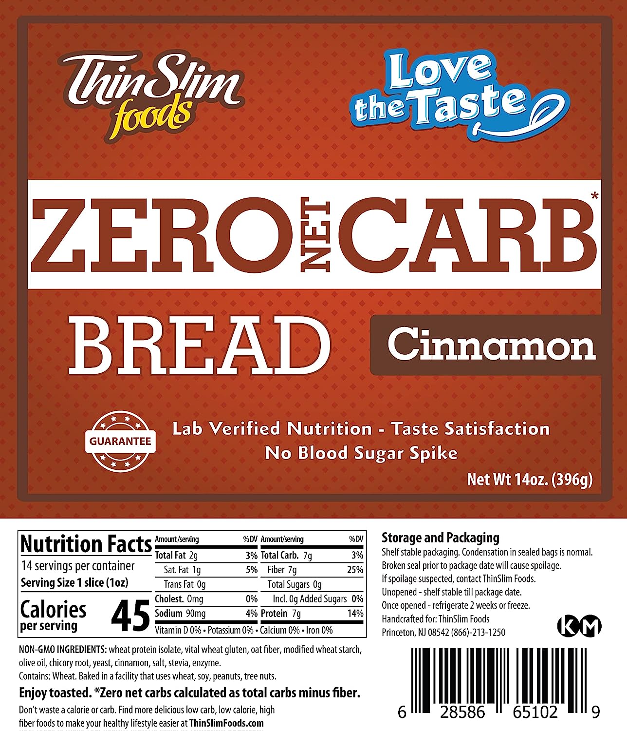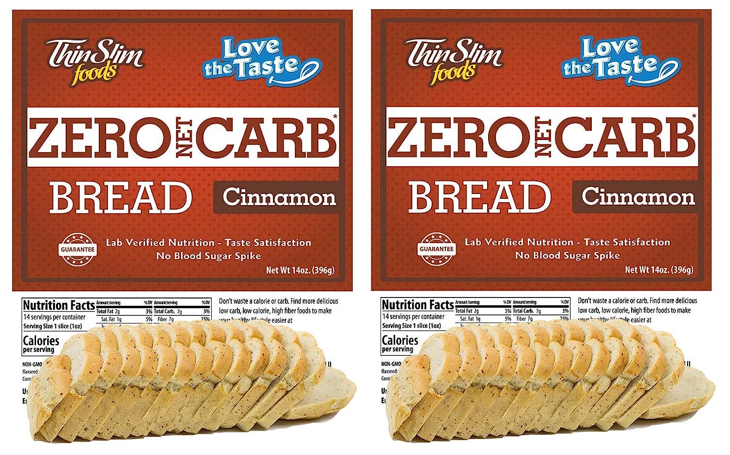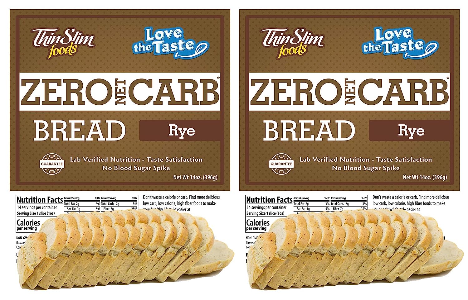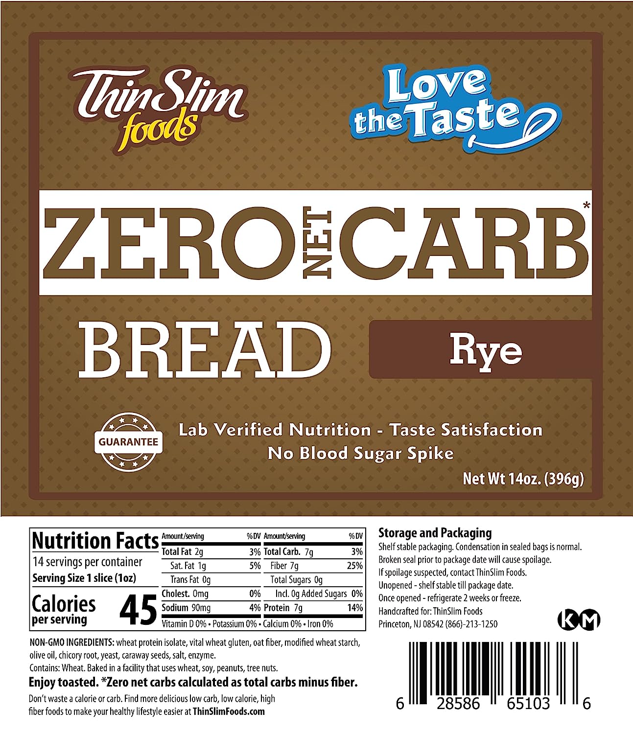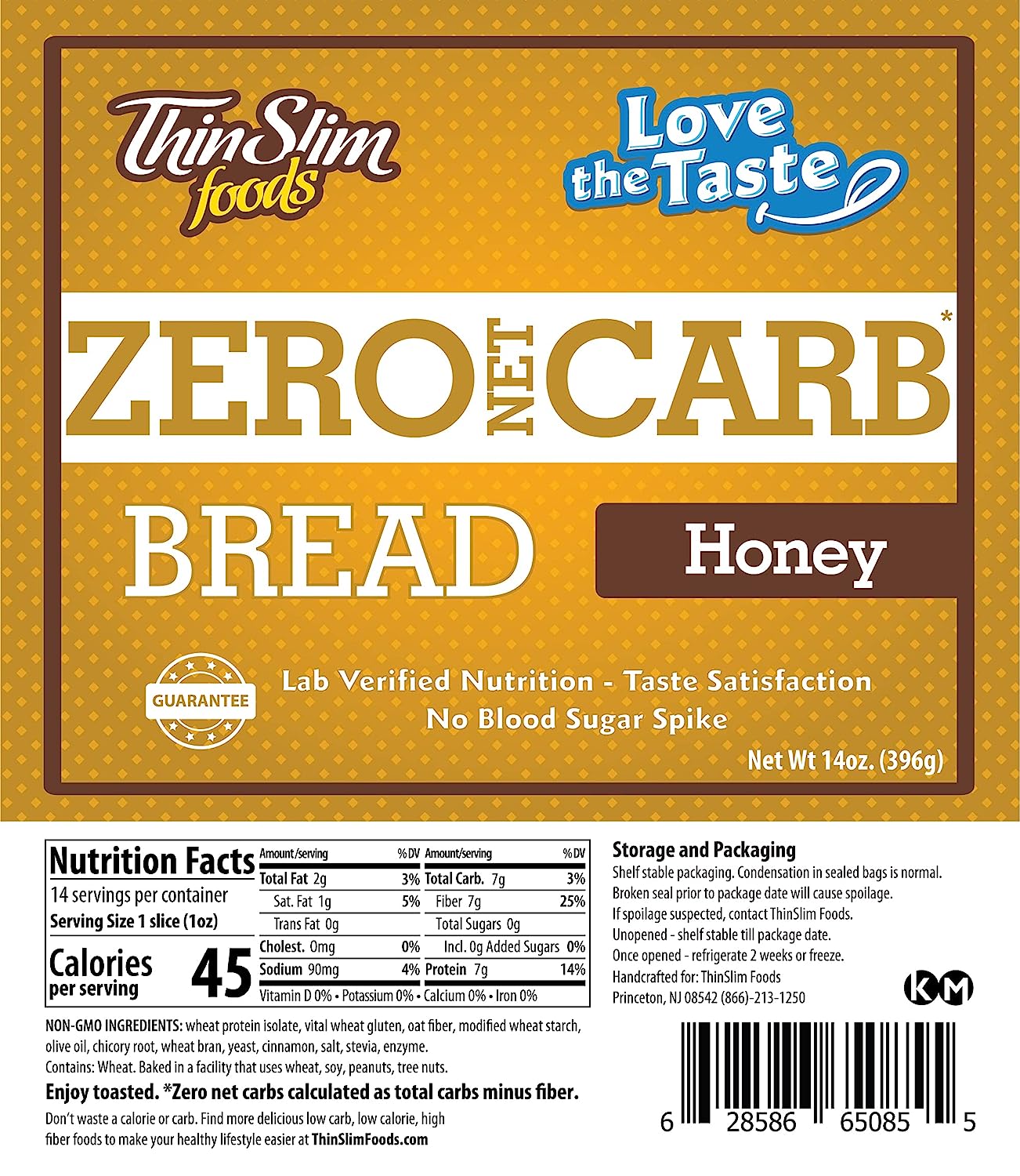 ThinSlim Foods Zero Net Carb Keto Bread is Low Carb Bread handcrafted with a revolutionary dough that has delighted the low carb consumer for over 10 years. This shelf-stable, keto-friendly bread is created with the highest quality ingredients, with zero net carbs and 45 calories per slice. This is a 2-pack of plain bread, with 14 slices per package. The ingredients used in our low-calorie loaf digest more slowly than normal bread, which means you stay satiated longer and your body doesn't turn the excess sugar into fat. This plain sliced bread is the ideal option for diabetics and dieters, including those on low carb plans or who are following Atkins, Keto, Paleo, Mediterranean, Whole30, Dukan, or South Beach diets. With 7g total carbohydrates and 7g of fiber in every slice, ThinSlim Foods zero net carb bread is proven to not cause a blood sugar spike. Our delicious, low GI sandwich bread has no soy or soybean oil, no almond flour, and our nutritional facts are independently lab-tested for accuracy. Our taste assurance: We're so confident that you'll love our products, that if you don't, let us know and we'll refund up to 1 of each flavor/type of product. Ingredients: wheat protein isolate, vital wheat gluten, oat fiber, modified wheat starch, olive oil, chicory root, yeast, salt, enzyme. Allergens: Contains wheat. Baked in a facility that uses wheat, soy, peanuts, tree nuts, eggs, and dairy. Storage: Unopened - Shelf stable till package date. Opened - Refrigerate 2 weeks or freeze.