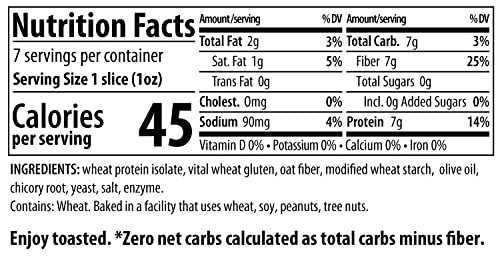 • ZERO NET CARB Bread: Each slice of our low carb bread is zero net carbs with 7g of protein, 7g of fiber, and only 45 calories. Don't waste a calorie or carb!