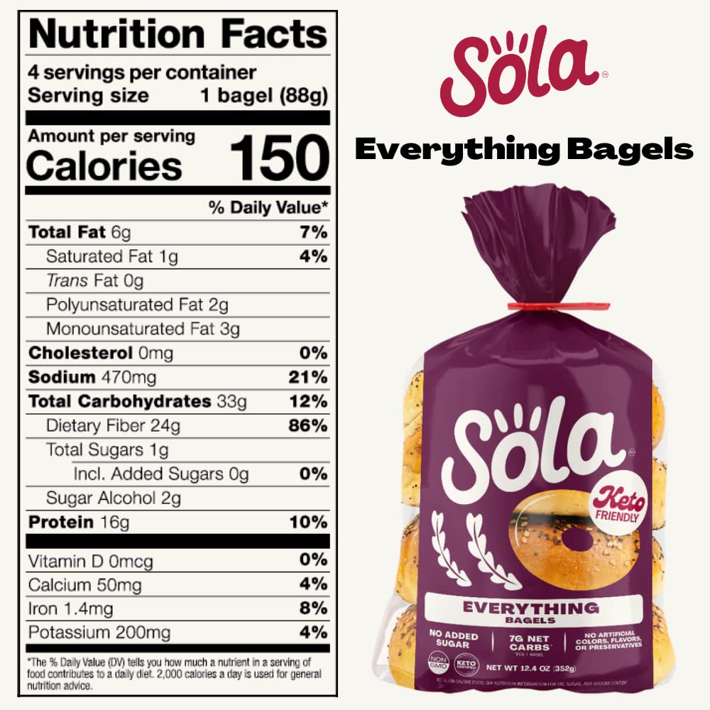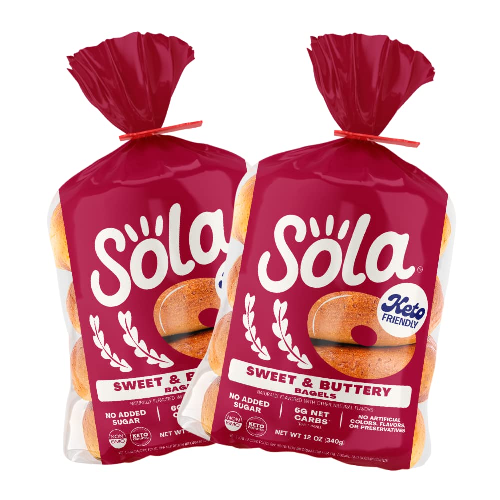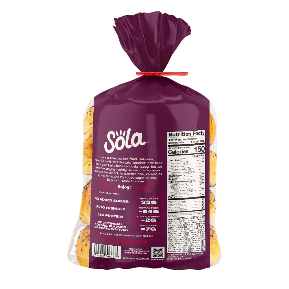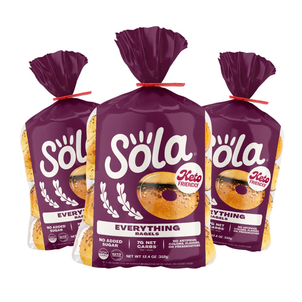 "The low-carb, keto-friendly bagels your breakfast needs LOWER NET CARBS: Using a mixture of arrowroot flour and defatted soy flour we have crafted a mix that allows us to lower the carb count in our bread products, without sacrificing taste. 0G OF SUGAR: We officially have 0g of sugar in every flavor of bagels. We use a mixture of low-carb sweeteners such as erythritol and stevia leaf extract to help create the fluffy, chewy texture you expect from a bagel. Enjoy Sola low-carb & keto-friendly bagels that allow you to eat your favorites without losing any of the taste!"