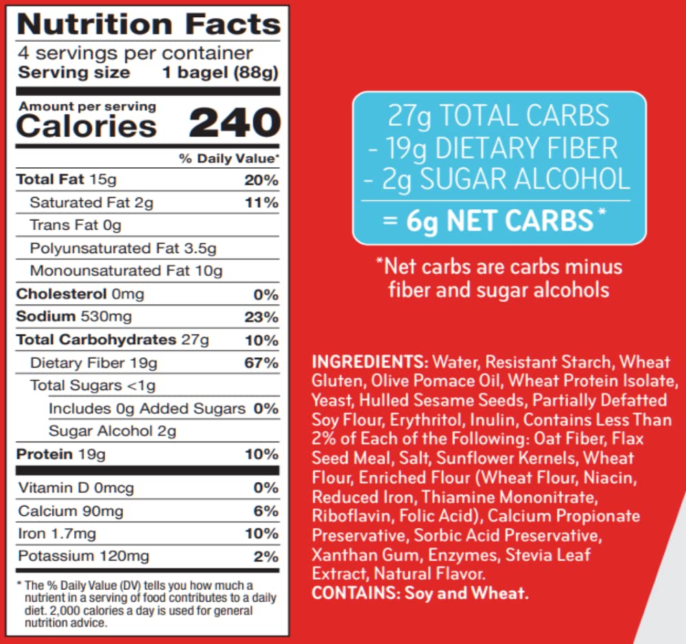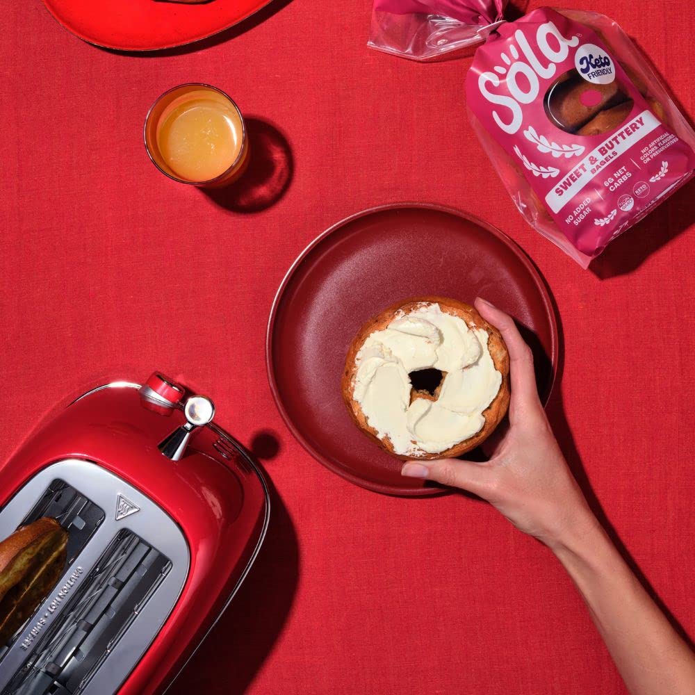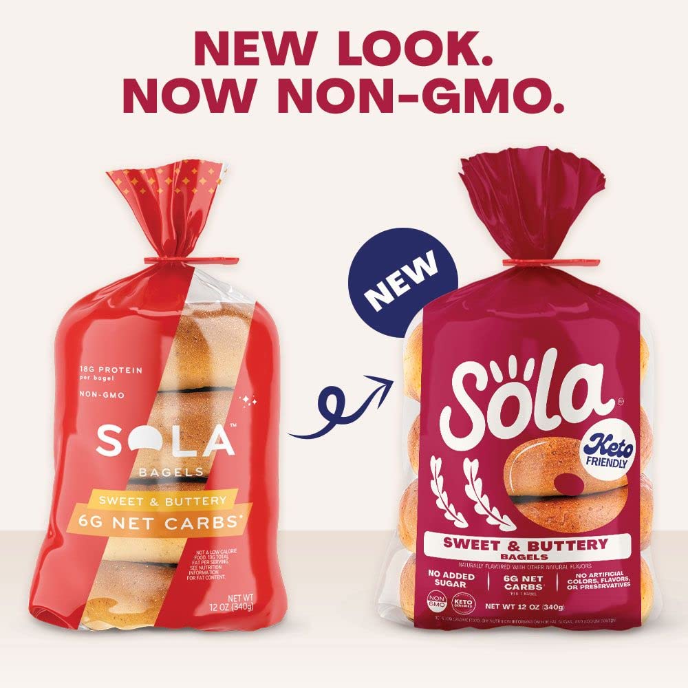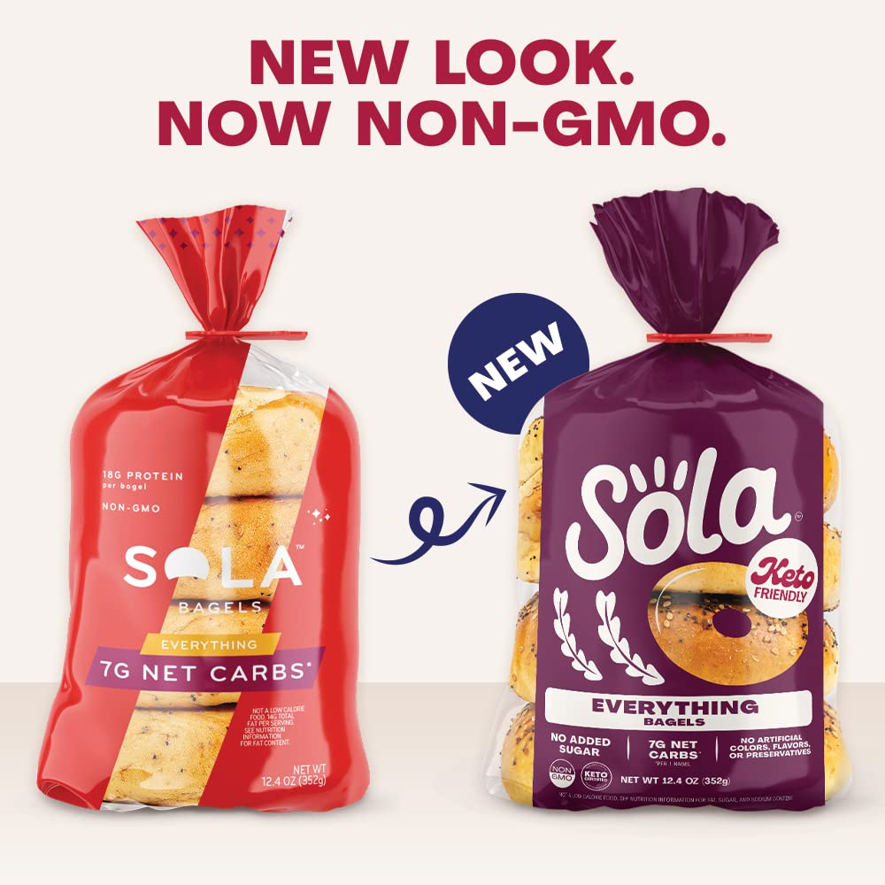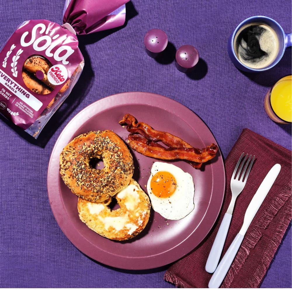 "The low-carb, keto-friendly bagels your breakfast needs LOWER NET CARBS: Using a mixture of arrowroot flour and defatted soy flour we have crafted a mix that allows us to lower the carb count in our bread products, without sacrificing taste. 0G OF SUGAR: We officially have 0g of sugar in every flavor of bagels. We use a mixture of low-carb sweeteners such as erythritol and stevia leaf extract to help create the fluffy, chewy texture you expect from a bagel. Enjoy Sola low-carb & keto-friendly bagels that allow you to eat your favorites without losing any of the taste!"
