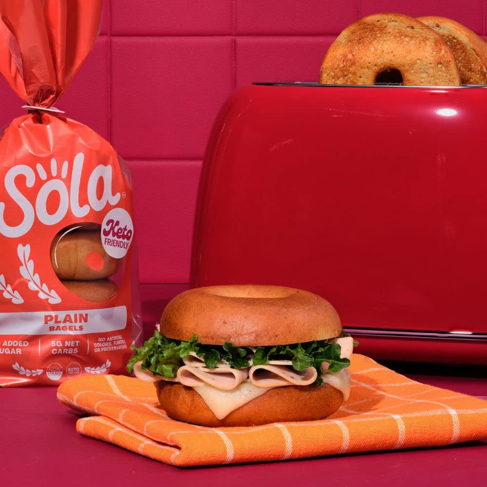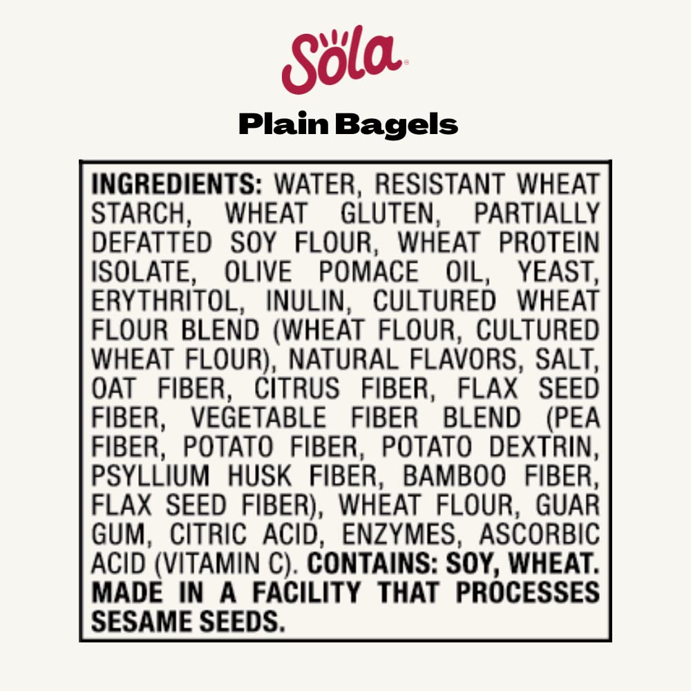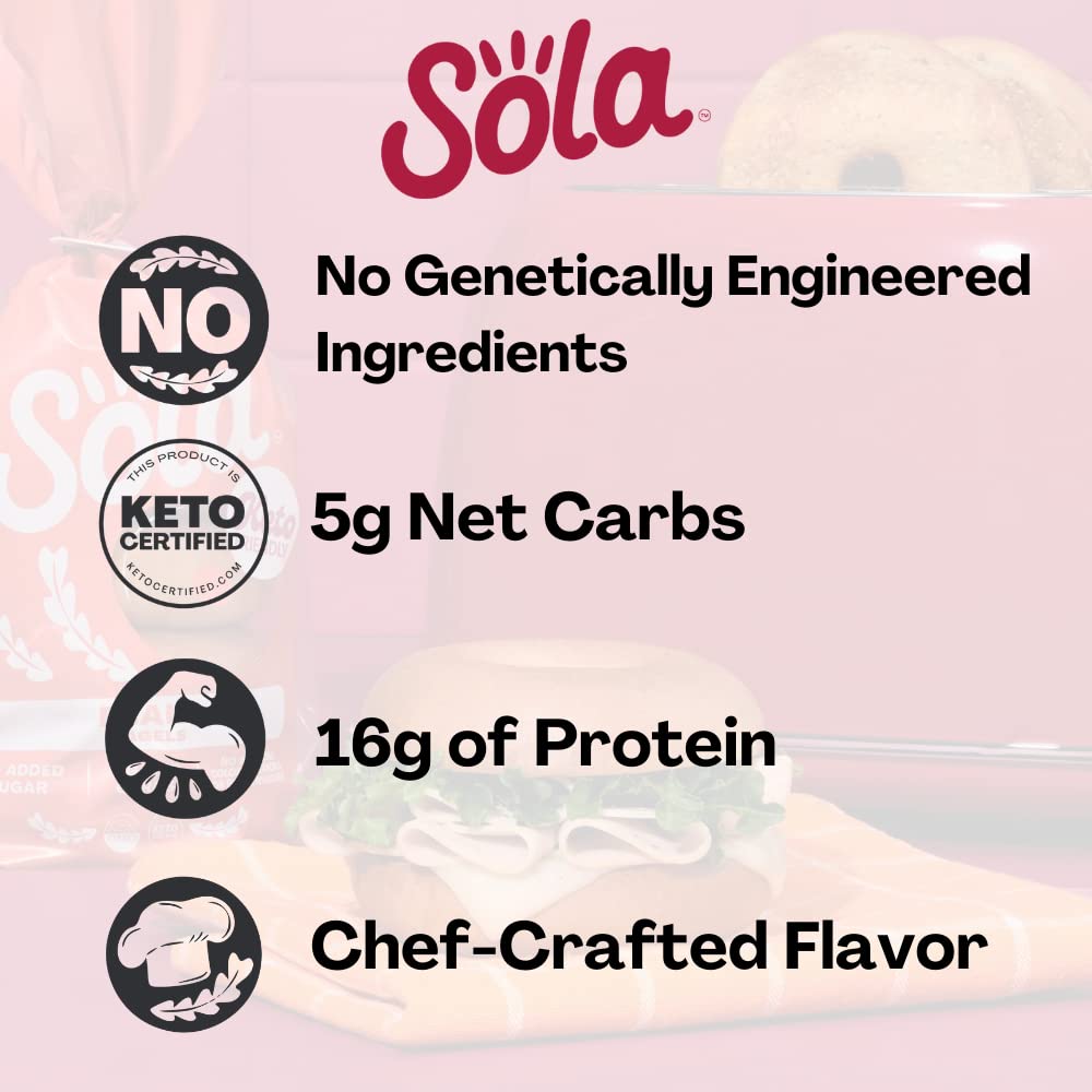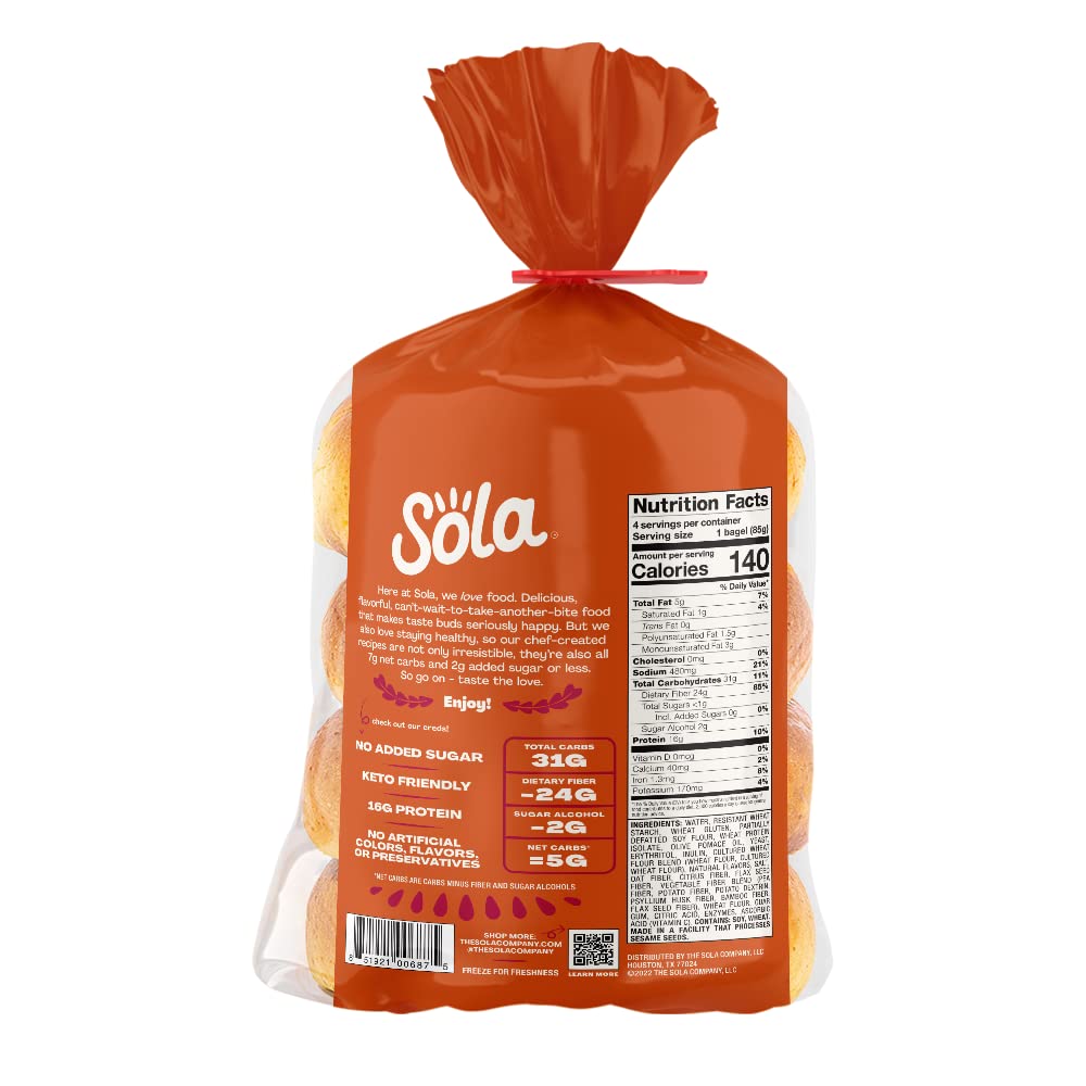 "The low-carb, keto-friendly bagels your breakfast needs LOWER NET CARBS: Using a mixture of arrowroot flour and defatted soy flour we have crafted a mix that allows us to lower the carb count in our bread products, without sacrificing taste. 0G OF SUGAR: We officially have 0g of sugar in every flavor of bagels. We use a mixture of low-carb sweeteners such as erythritol and stevia leaf extract to help create the fluffy, chewy texture you expect from a bagel. Enjoy Sola low-carb & keto-friendly bagels that allow you to eat your favorites without losing any of the taste!"