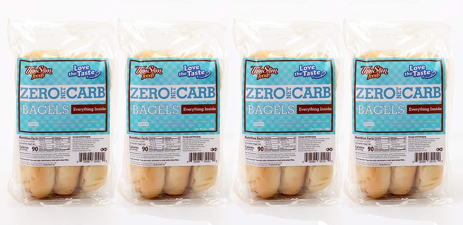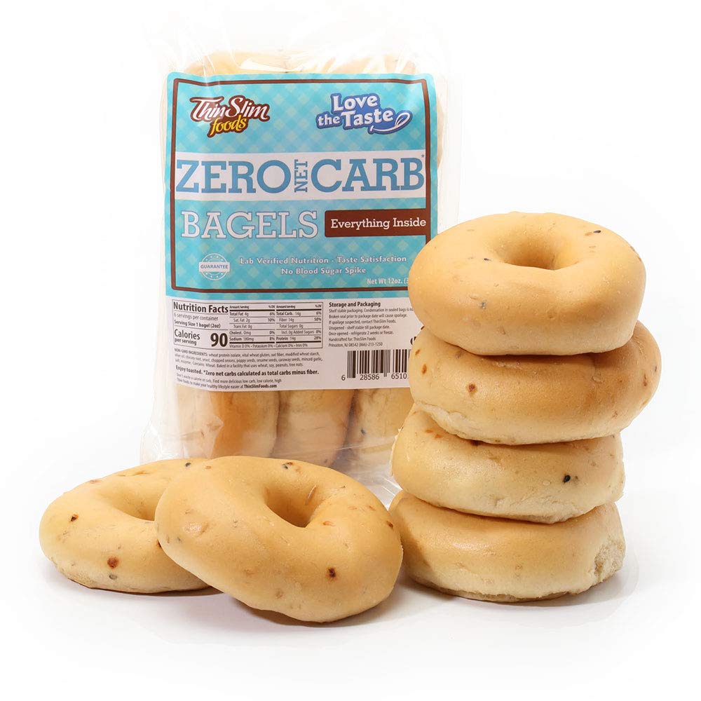 With zero net carbs per bagel, these ThinSlim Foods Love-the-Taste Plain Bagels are handcrafted with a revolutionary dough that has a consistency similar to full carb bagels. The keto-friendly bagels, which come in a pack of 2 with 6 bagels in each, are created with the highest quality ingredients, and each bagel has only 90 calories and zero net carbs.The ingredients used in our low-calorie bagels digest more slowly than normal bagels, which means you stay satiated longer and your body doesn't turn the excess sugar into fat. Our plain bagels are the ideal option for diabetics and dieters, including those on low carb plans or who are following Atkins, Keto, Paleo, Mediterranean, Whole30, Dukan, or South Beach diets.With 14g of total carbohydrates and 14g of fiber in every bagel, ThinSlim Foods low calorie bagels are proven to not cause a blood sugar spike. Our delicious, low GI bagels have no soy or soybean oil, and our nutritional facts are independently lab-tested for accuracy.Our taste assurance: We're so confident that you'll love our products, that if you don't, let us know and we'll refund up to 1 of each flavor/type of product.Ingredients: Wheat protein isolate, vital wheat gluten, oat fiber, modified wheat starch, flax seed meal, olive oil, chicory root, yeast, salt, apple cider vinegar.Allergens: Contains wheat. Baked in a facility that uses wheat, soy, peanuts, tree nuts, eggs, and dairy. Storage: Unopened - Shelf stable till package date. Opened - Refrigerate 2 weeks or freeze.