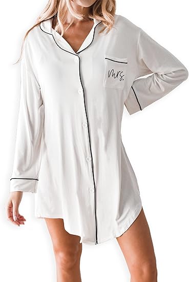 ModParty Mrs. Heart Sleep Shirt | Getting Ready Bride Outfit | Future Bride Pajama Wear | Button Down Night Gown | Bridal Shower, Engagement, & Wedding Gift Idea White