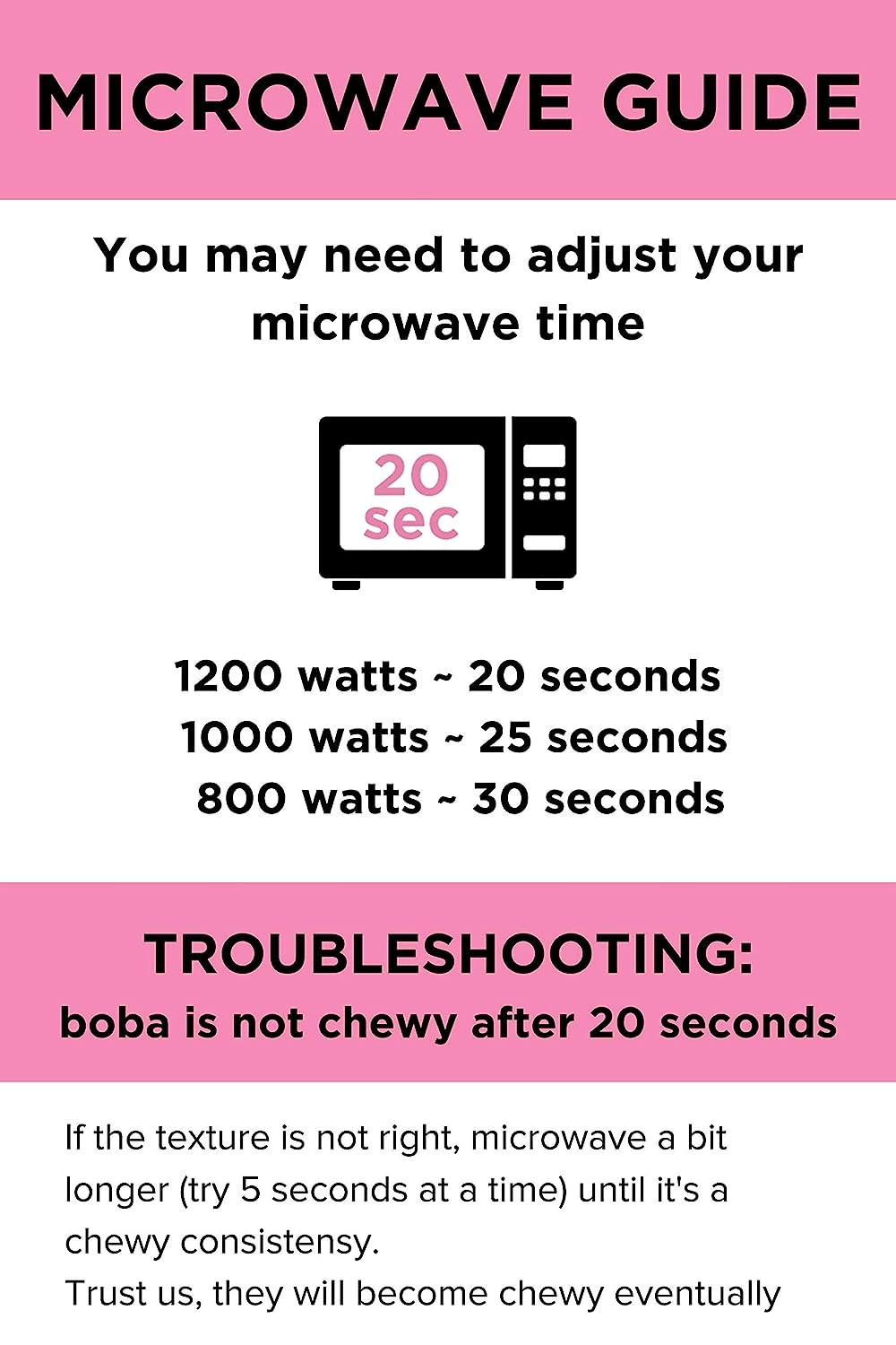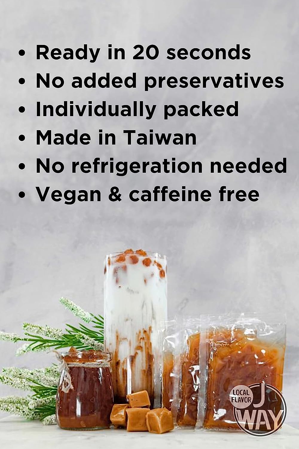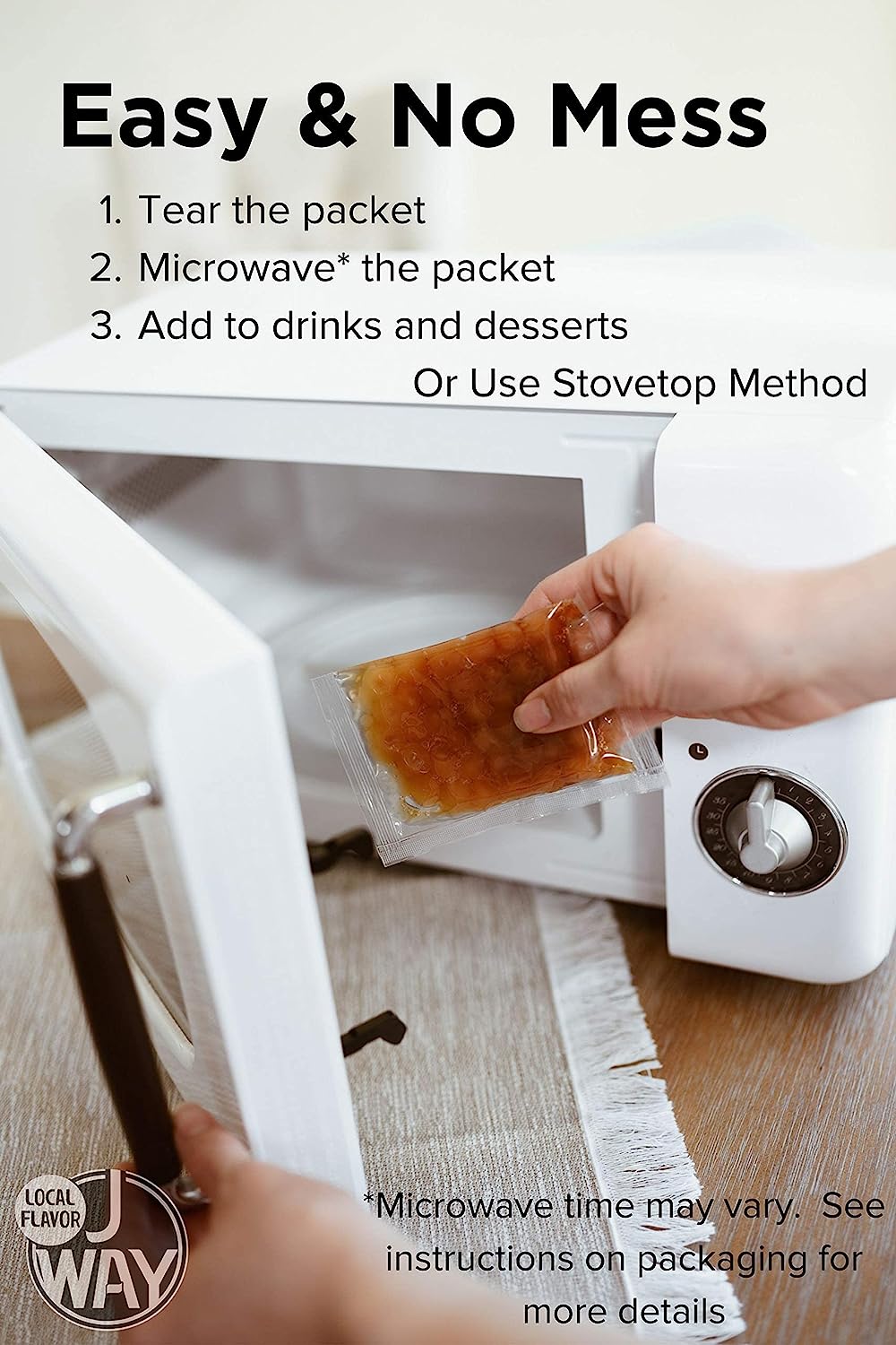 • 🥤BOBA NOW- READY IN 20 SECONDS-Preservative free instant tapioca pearls, coated in a light caramel syrup, individually packed microwaveable single-serving portions. Or simply place pouch in boiling water for bubble tea on the go.