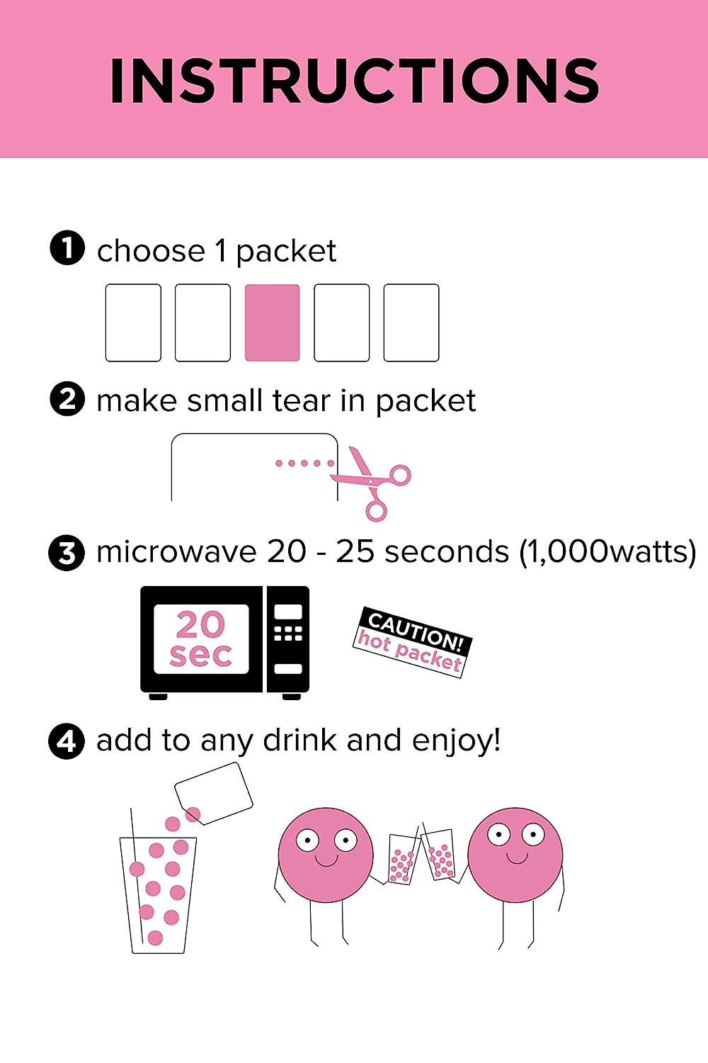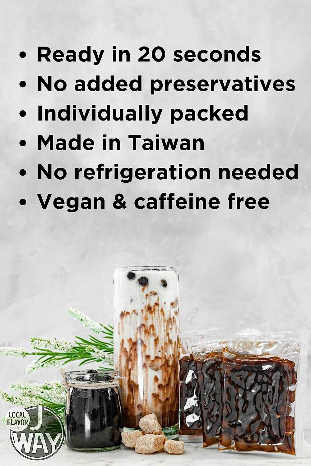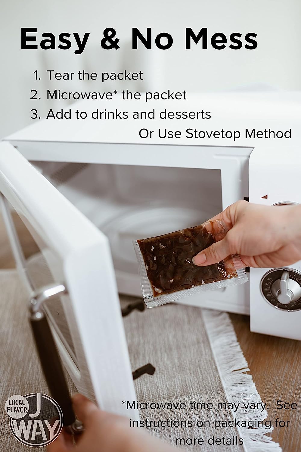 • 🥤BOBA NOW- READY IN 20 SECONDS-Preservative free instant tapioca pearls, coated in a light caramel syrup, individually packed microwaveable single-serving portions. Or simply place pouch in boiling water for bubble tea on the go.