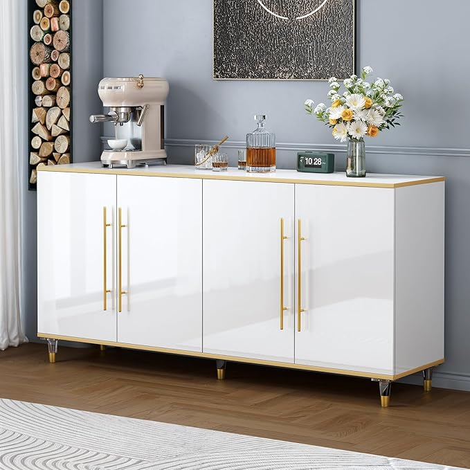63" Buffet Cabinet with Storage, High Glossy Sideboard Cabinet with Adjustable Shelves & Doors, Modern Storage Console Table, Coffee Bar Cabinet for Kitchen, Living Room, Hallway, White â__ Gold