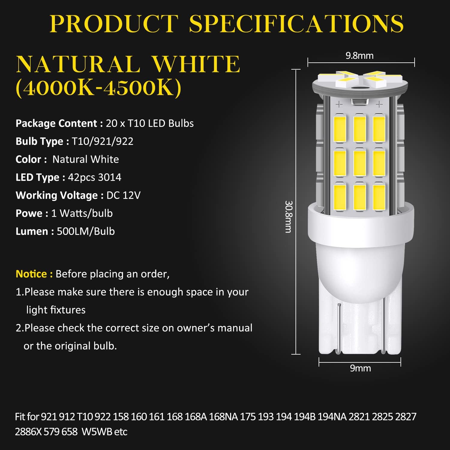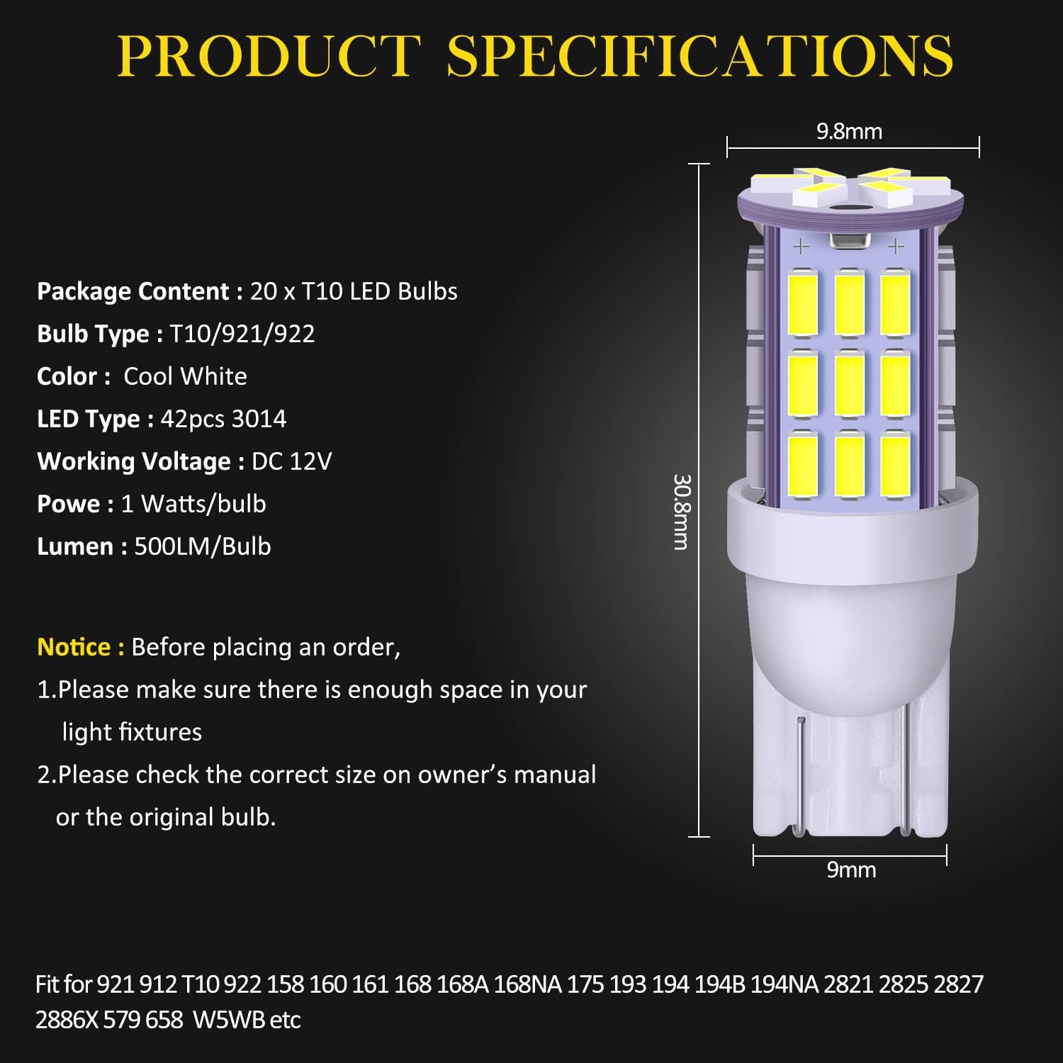 Size:921/194/168/T10 Xenon White