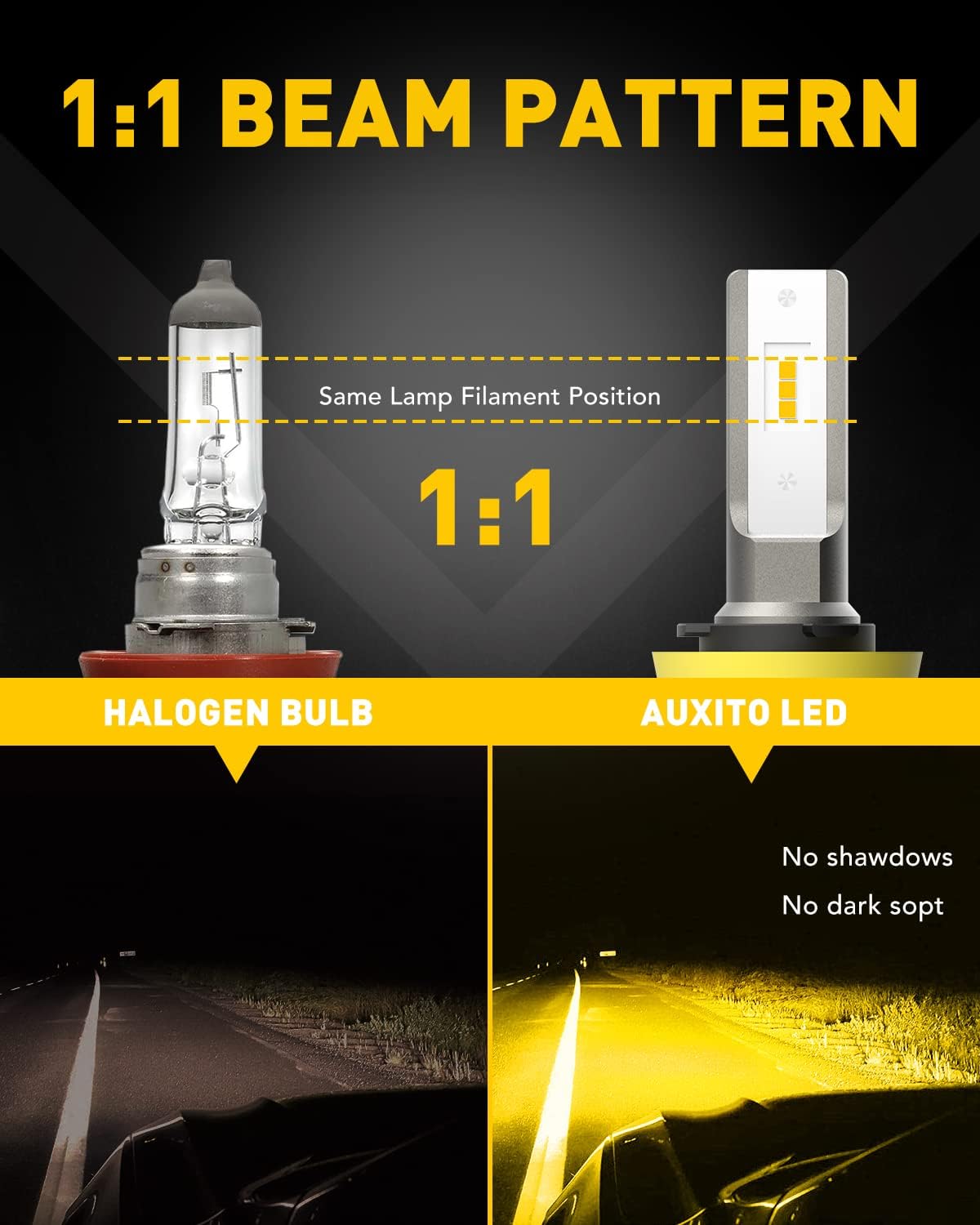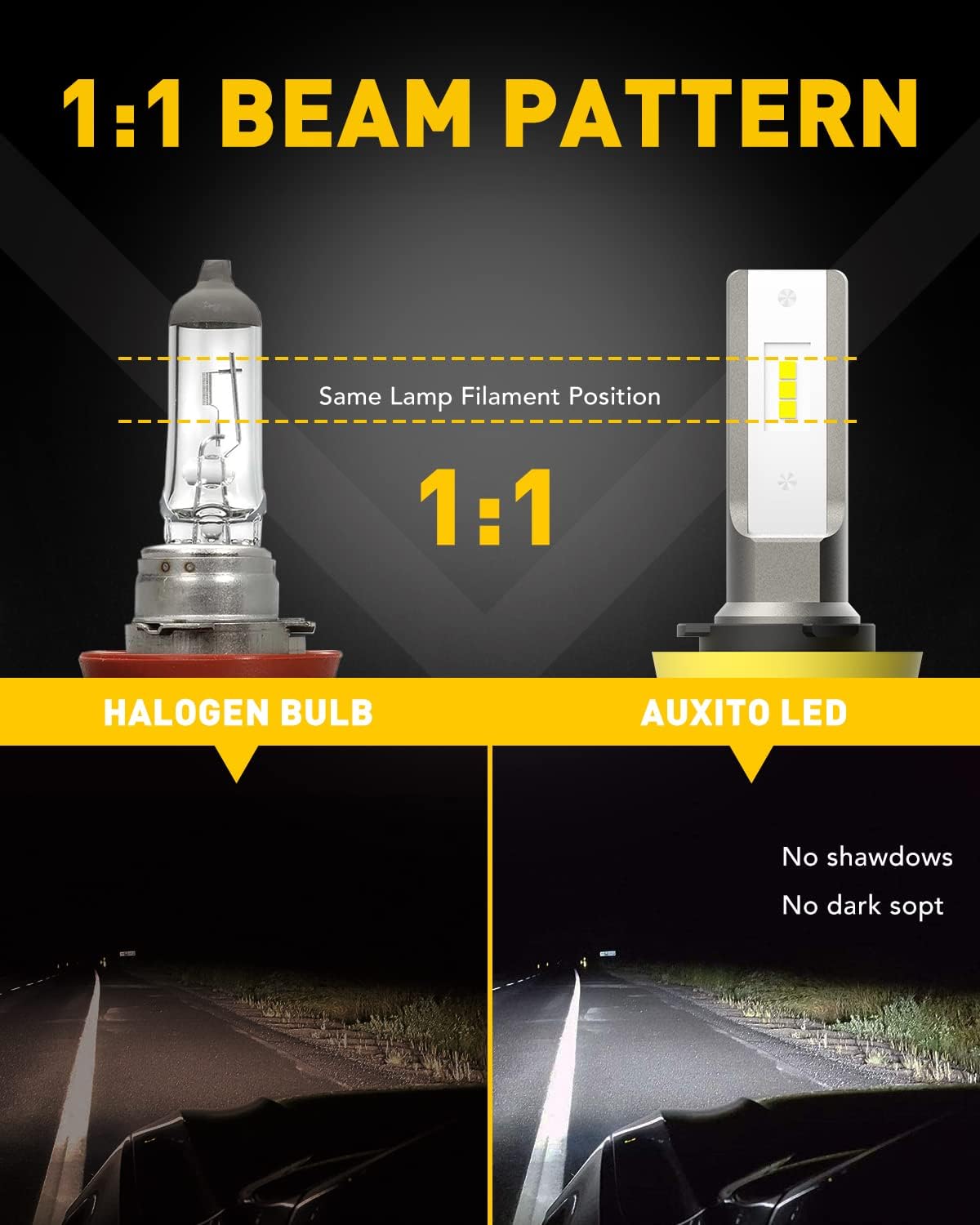 • 1:1 Safe Beam Pattern: Same light filament position. AUXITO H8 fog light bulb perfectly simulates the factory halogen bulbs’ beam pattern, comes out 360° full angle illumination. No shadows, No dark spots, delivering the more extensive vision and safer driving experience