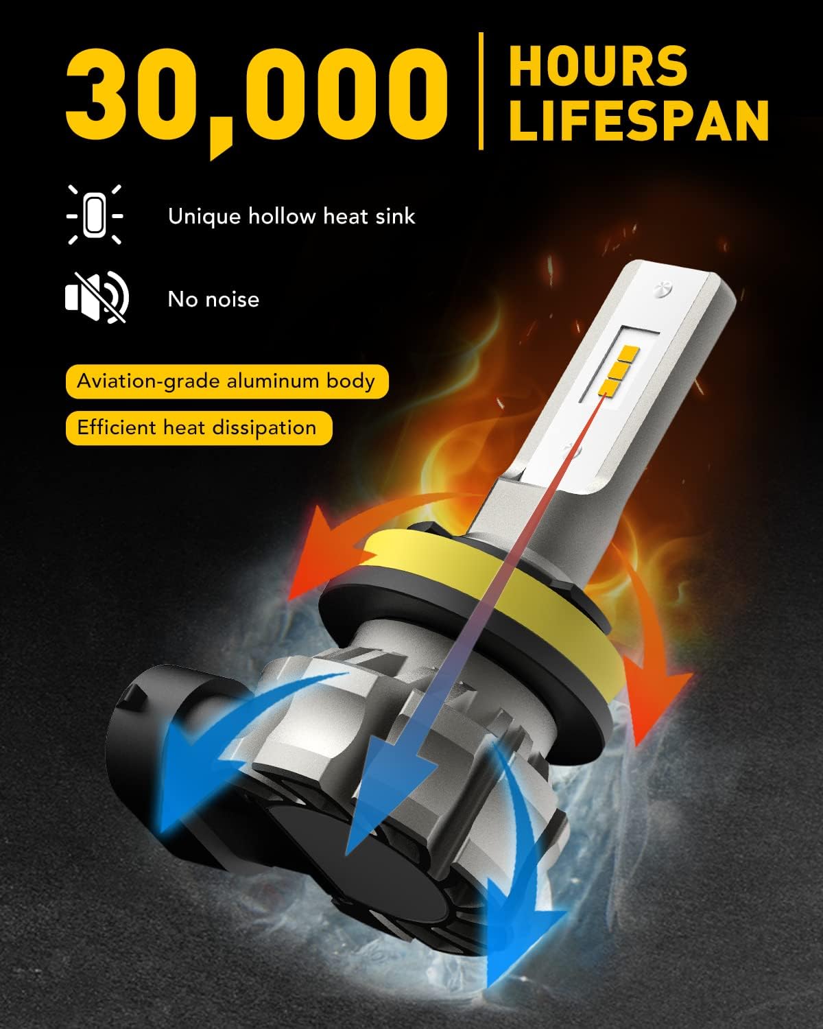 • 30,000hrs Long Lifespan: Fanless design to avoid dust getting inside and noise. The all-in-one compact design with full-body aluminum material, provides fast and stable heat dissipation to maximize the lifetime and performance of AUXITO H8 fog lights
