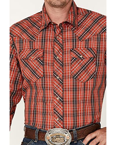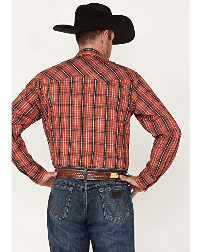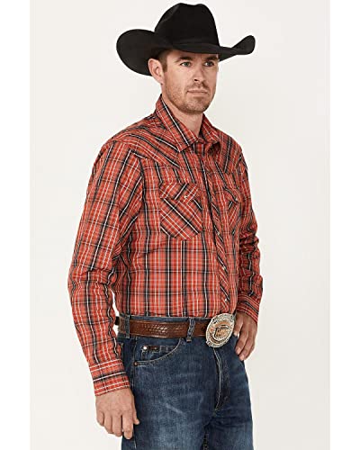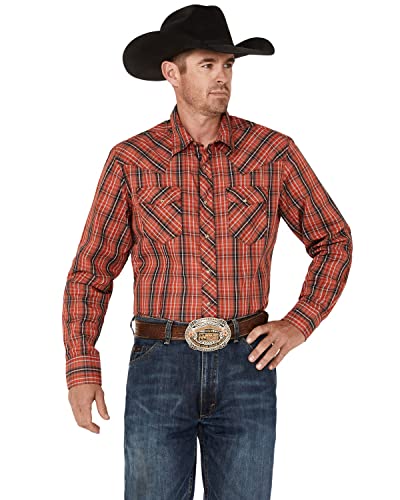 Details: Wrangler Molten Red 100% CottonSlim Fit Long Sleeve Two front pockets with snaps Two Point Back yoke Two snap cuff 112317069 Serving that classic Wrangler style at its best, this men's long-sleeve fashion western snap plaid shirt comes with all the distinctive details you know and love. It features rancher's crease styling in the front, a pointed front yoke, a sawtooth-inspired back yoke, two snap cuffs, double snap flap pockets at the chest, and a curved hem for versatility. It's made of cotton to keep you comfortable all year long and it features a modern fit. You can leave it untucked or tuck it into your favorite Wrangler jeans, with a t-shirt underneath if you feel like layering.