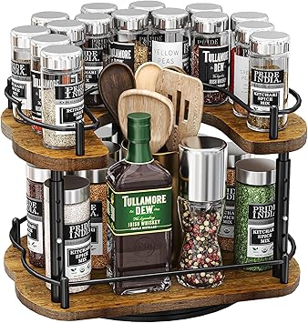 Lazy Susan Organizer Spice Rack - Height Adjustable Rotating Lazy Turntable Spice Organization for Cabinet, Pantry Kitchen Wood Revolving Seasoning Organizer, 12 inches, Black