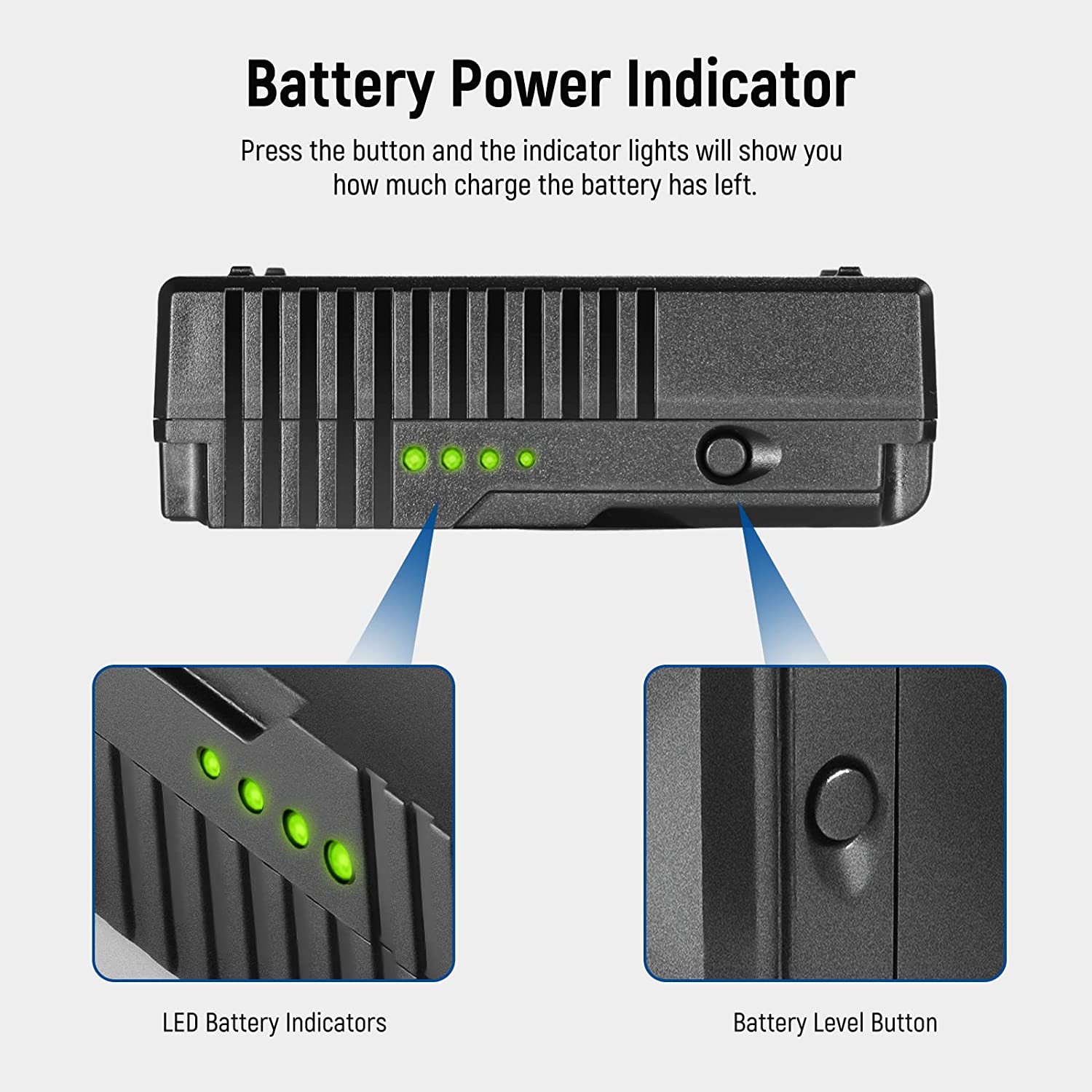 • 【LED Power Indicators】The 4 battery power indicators show remaining battery life so that you can charge in time. 1 LED on: 25%, 2 LEDs on: 50%, 3 LEDs on: 75%, 4 LEDs on: 100%
