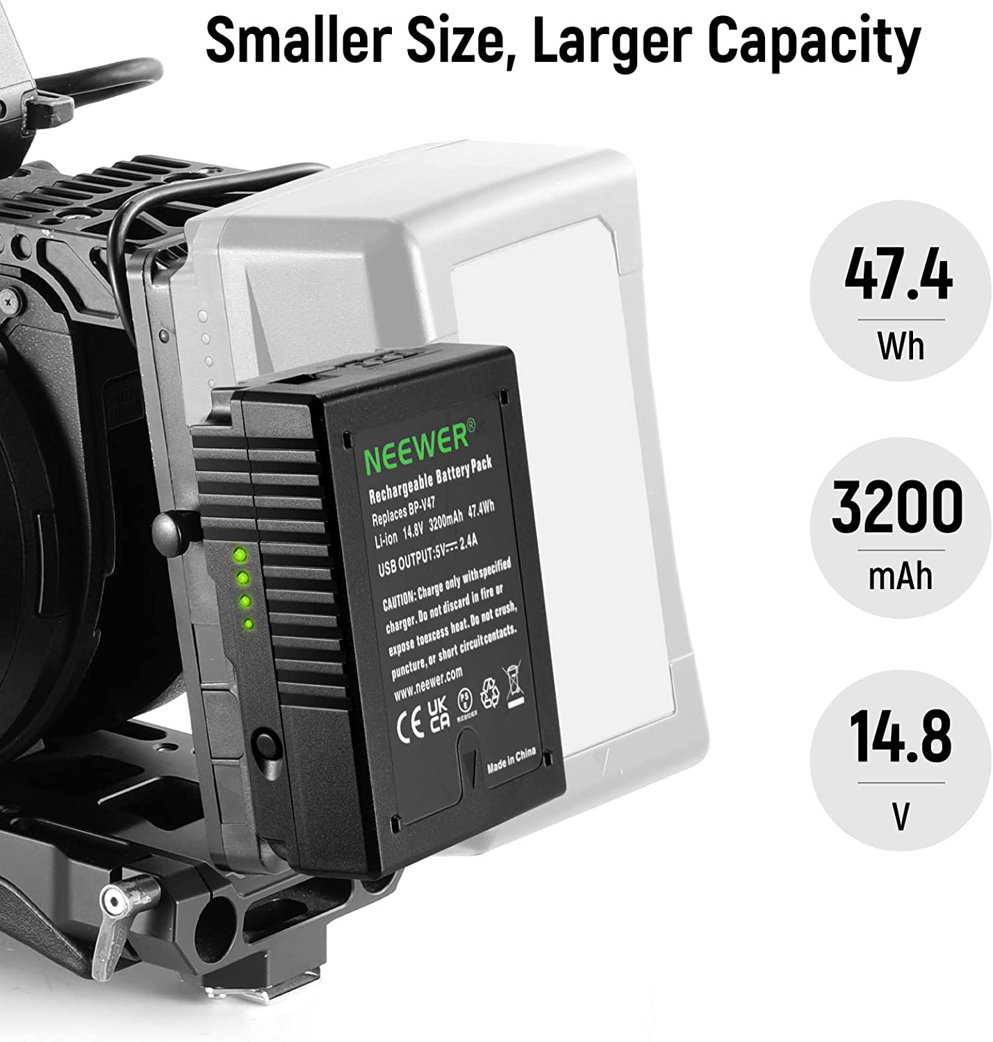 • 【High Capacity, Small Size】 NEEWER BP-V47 47Wh 14.8V 3200mAh V Mount Battery features high battery capacity and a compact size of 4.1” x 3” x 1.4” (105 x 75 x 35mm). It provides 9A maximum draw for professional video cameras and camcorders while being portable for handheld filmmaking and photography
