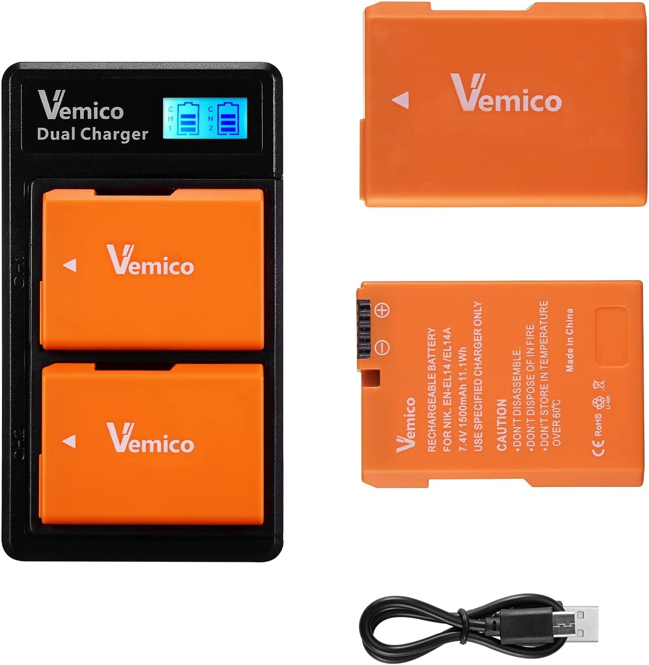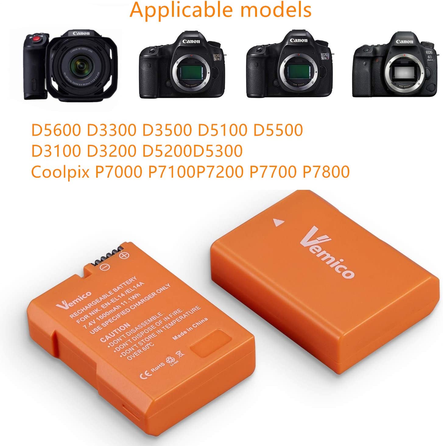 Vemico EN-EL14 EN-EL14A Battery Charger Set 2 x 1500mAh Replacement Batteries Dual Slot LCD Charger Pack for Nikon D5100/D5300/D5500/D3100/D5600/D3200/D3300/D5200/Coolpix P7000/P7100/P7200/P7700/P7800