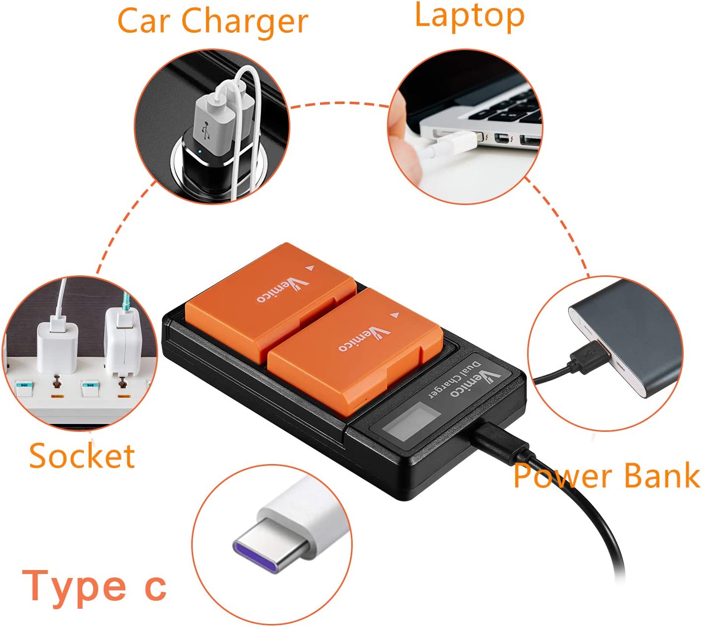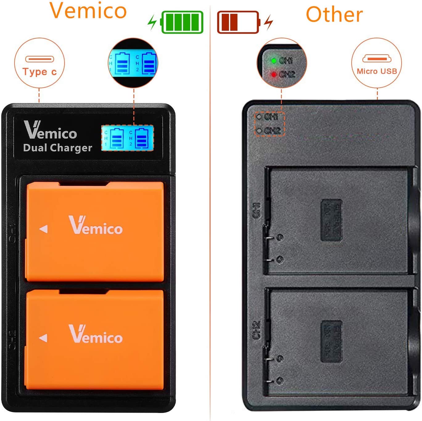 • 【Dual Slots LCD Charger】 The Vemico 5V-2A dual slots charger can charge two original NEN-EL14 batteries and OEM customized batteries simultaneously and independently from any Type-C power source. With a LCD, the charging status of each battery shown clearly.
