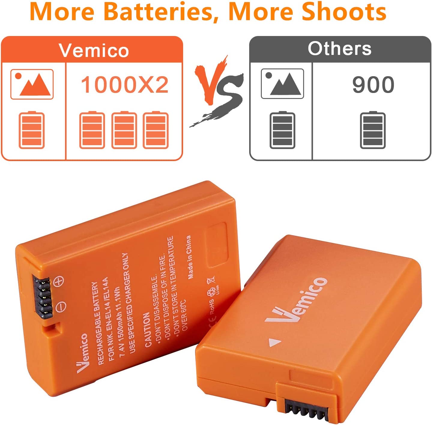 • 【More Batteries More Photos】 Vemico EN-EL14 battery and charger provide enough power for your Nikon camera. Two additional 1500mAh spare batteries and dual slots charger ensure a perfect snapshot without worries.