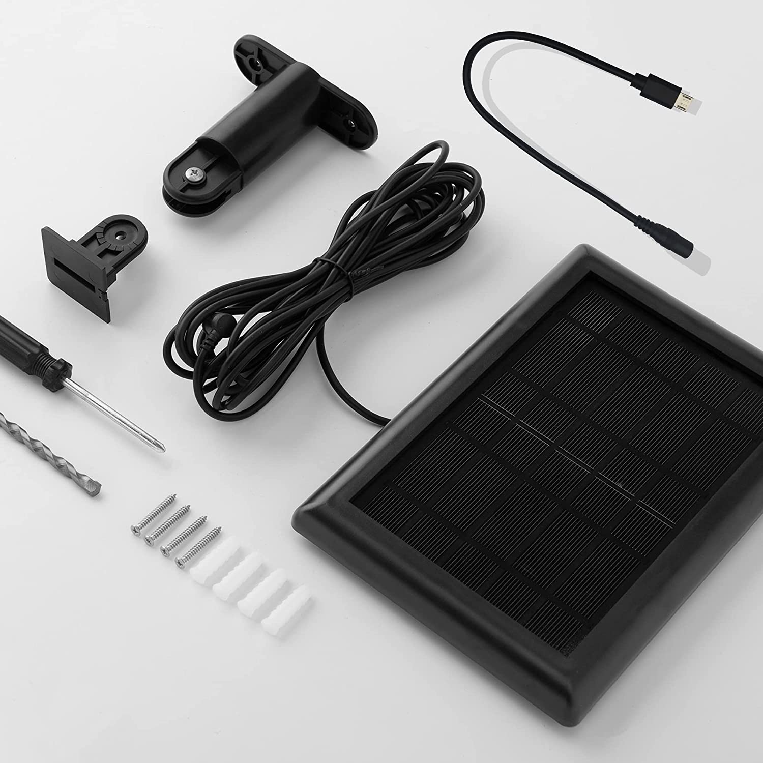 • 【Packing】2 x Solar Panel, 2 x 5m Outdoor Cable with Weatherproof Convert Micro USB Connector, 2 x Rotatable Mounting bracket and Drilling Bit, 8 x Screws and Screwdriver, 8 x Wall Anchors and a User Manual.