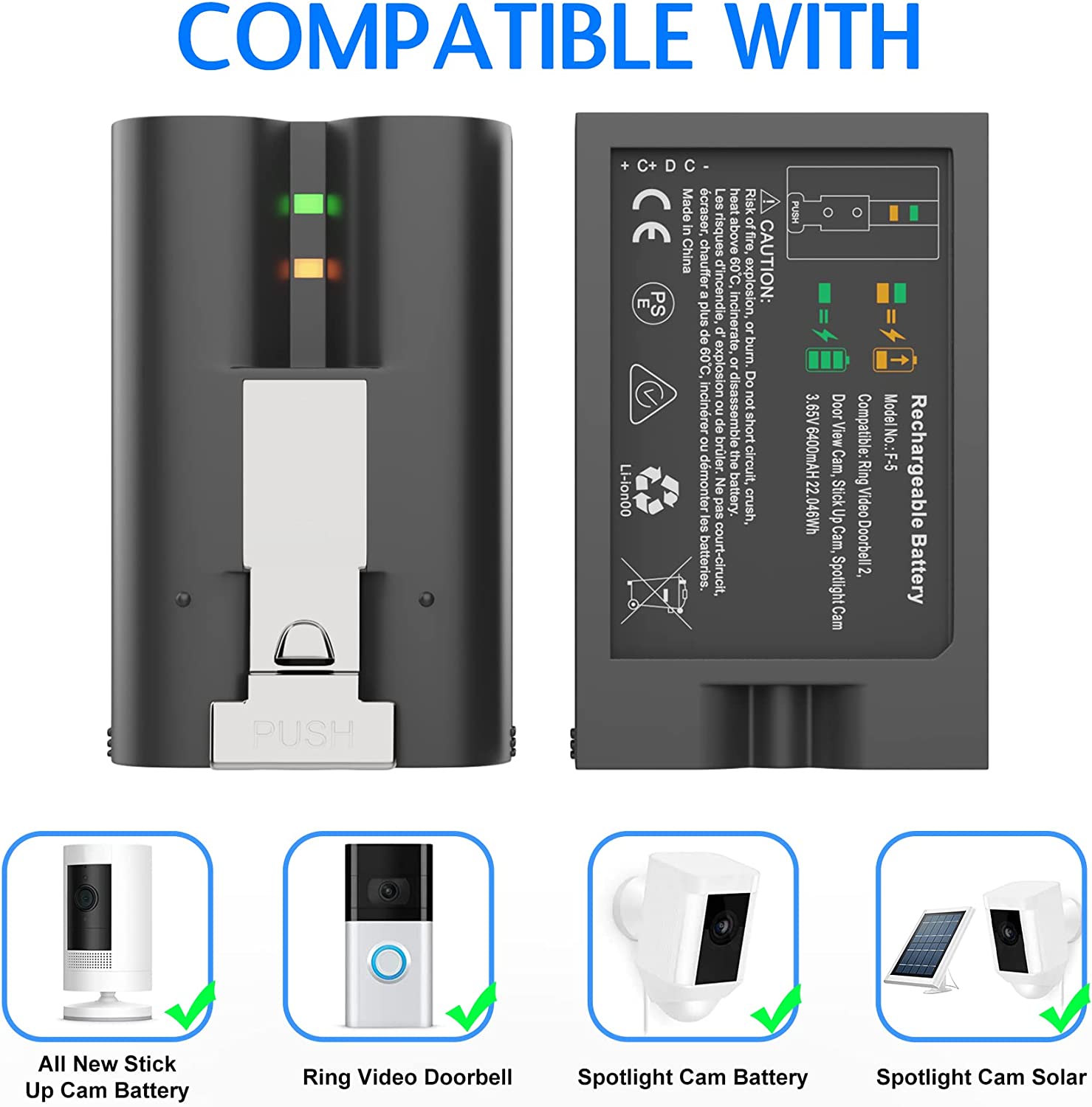 • 【More Secure Protection】: Built-in Multiple Circuit Protection (Over-Charging, Short-Circuit, High-temperature, And Surge Protection) And Fire-resistant Construction Can Ensure Your Safe Charge.3.65V 6040mAh Professional Replacement Battery for Ring.Premium Li-ion Cells for Longer Battery Life with no Memory Effect. Batteries Can be Charged or Discharged at Any Time Without Harm.