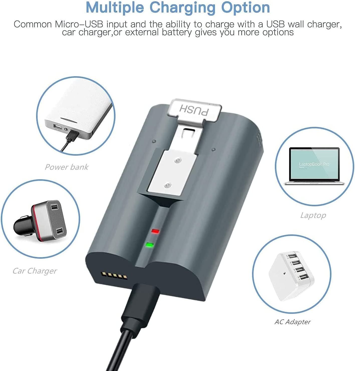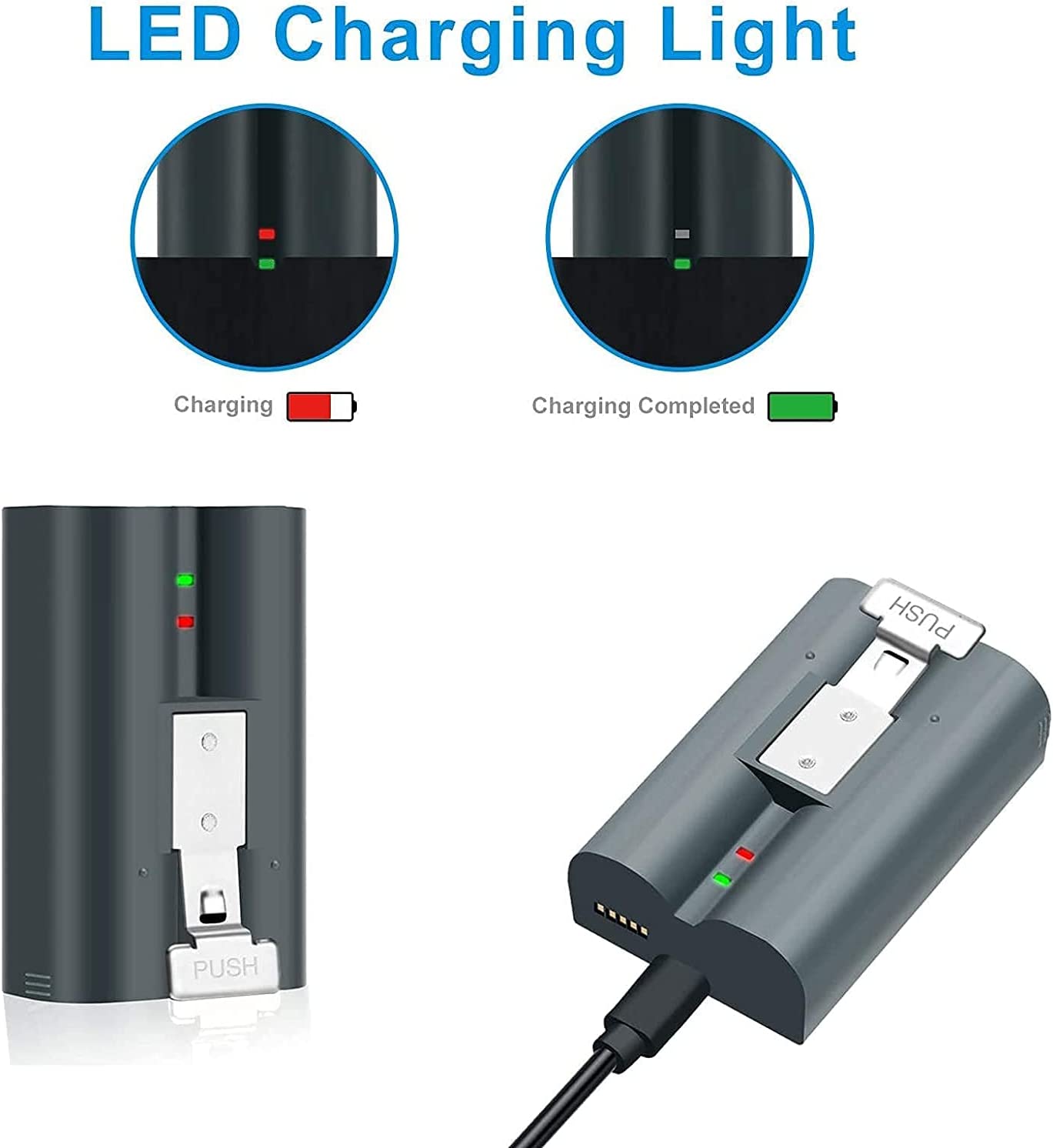 • 🔋🔔📸【LED Indication】: The battery is equipped with a signal indicator, which changes the charging state through the red and green indicators. When the red light and green light are on, the battery starts to charge. When only the green light is on, the battery is fully charged.