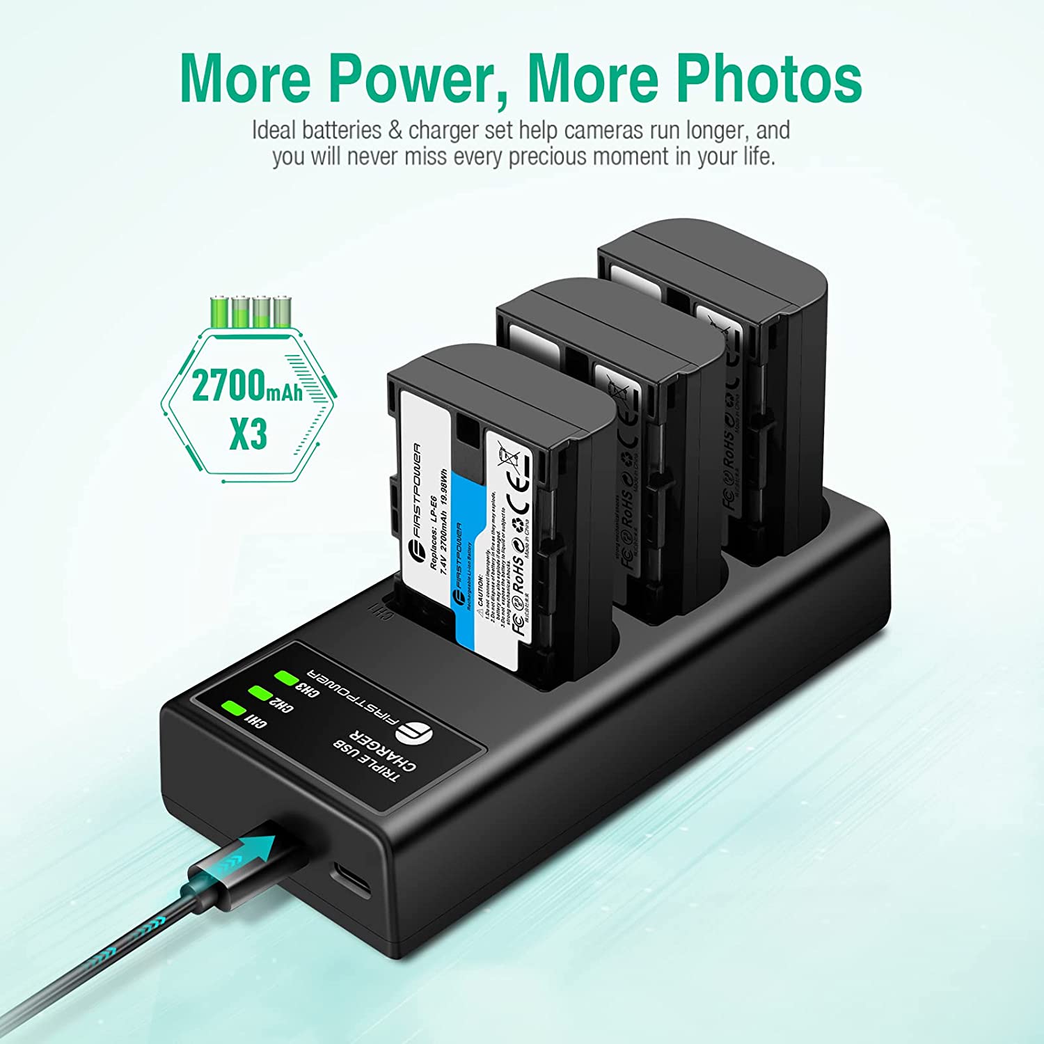 FirstPower LP-E6 LP E6N Battery 3-Pack 2700mAh and Triple Slot Charger for Canon EOS 5D Mark II III IV, 5DS, 5DS R, 6D, 6D Mark II, 7D, 7D Mark II, 60D, 70D, 80D, 90D