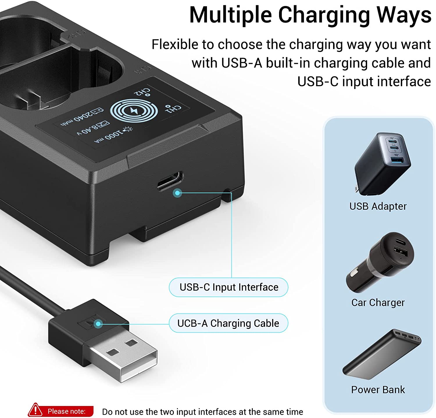 • 【Intelligent LCD Screen】Input: 5V/2.1A, double-slot design can charge two NP-W235 batteries at the same time. When Charger powered up, you can get all the information of each battery by LCD screen, including charging current, charging voltage, charging progress and charging capacity