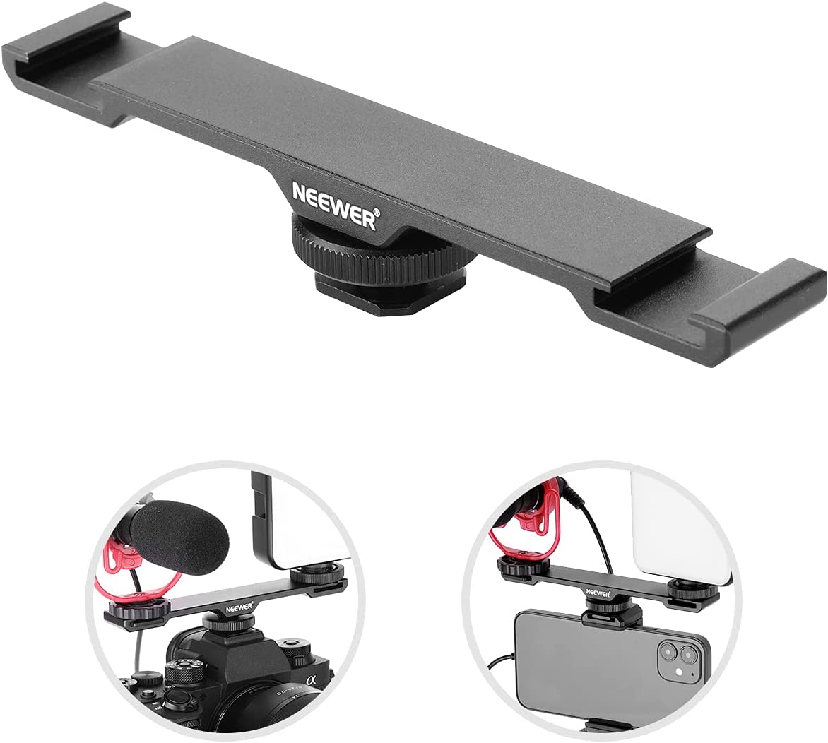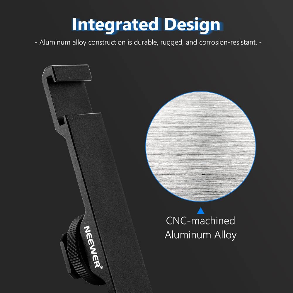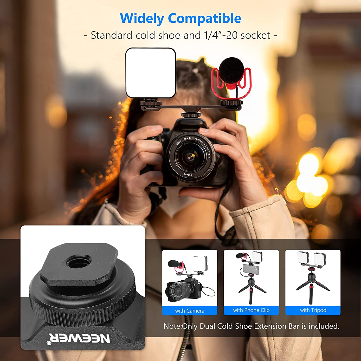 • 【Universal Dual Cold Shoes】 Neewer Dual Cold Shoe Extension Bar holds two peripherals, such as microphones, LED video lights, and external flashes on a DSLR camera or smartphone to improve vlogging, video calls, and photography