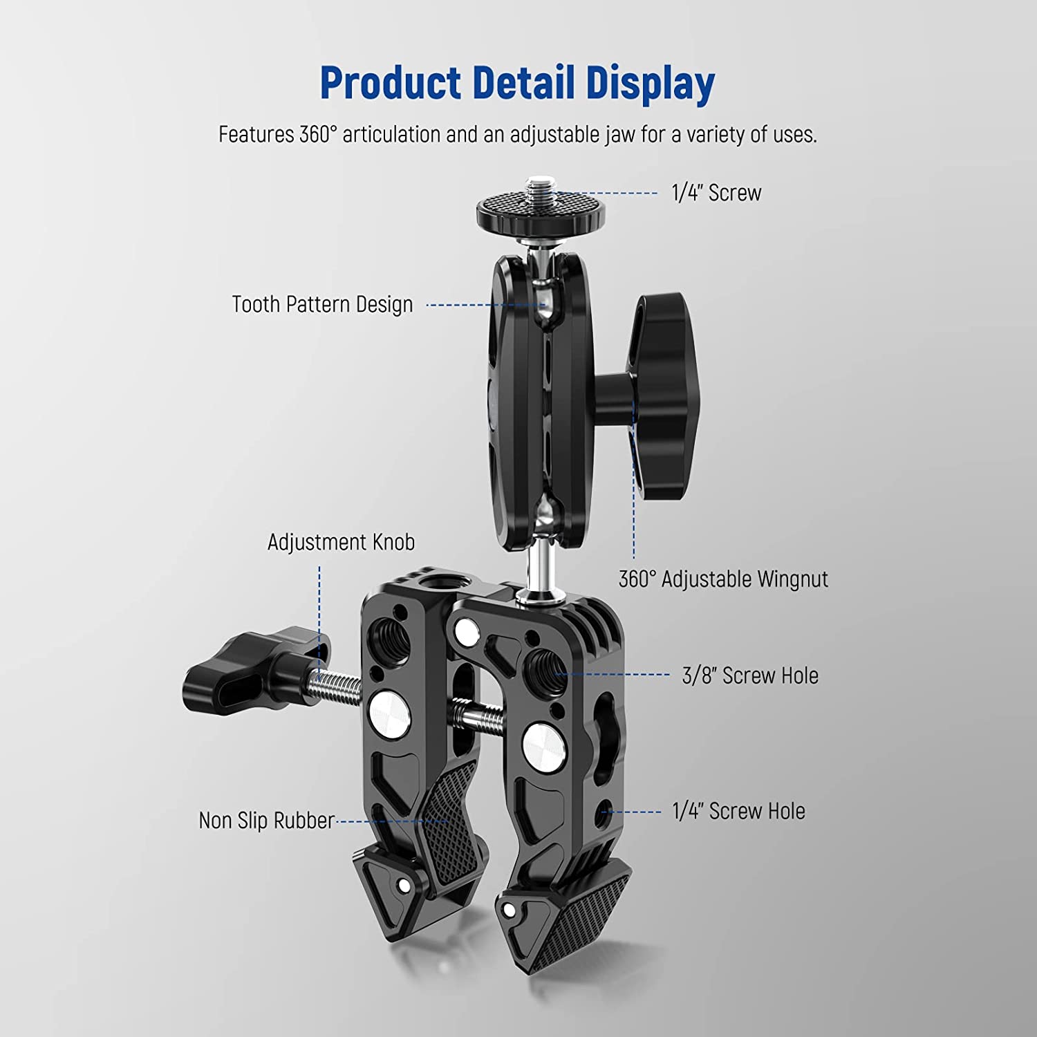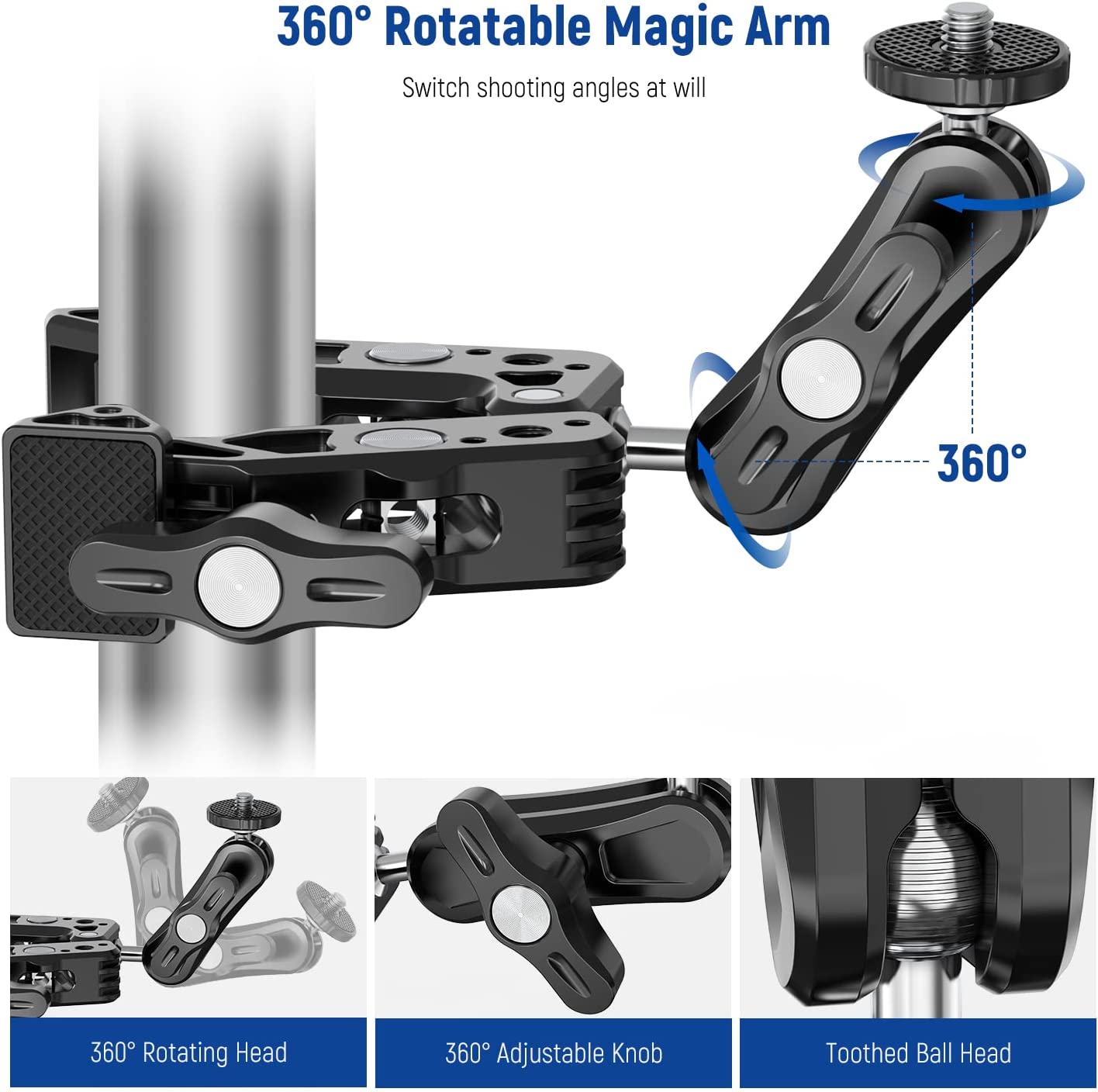 • 【360° Free Rotation Dual Ball Head】 A 3" (76mm) magic arm connecting two ball head adapters enables 360° free rotation with the help of the locking knob for flexible camera positioning