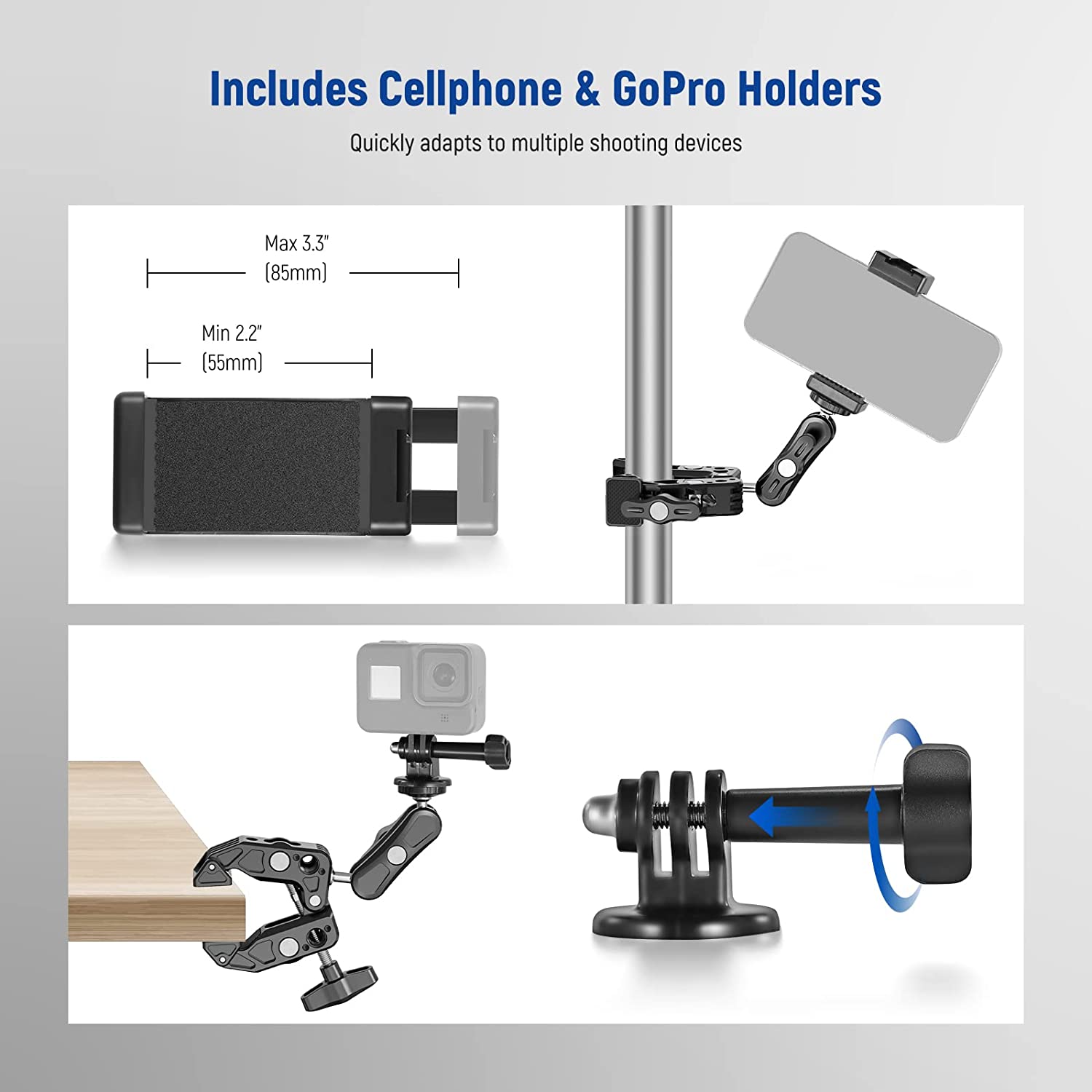 • 【Phone Holder & Action Camera Mount】 Also includes a 2.2" - 3.3" (55 - 85 mm) adjustable phone holder and an action camera mount adapter, respectively compatible with iPhone 14 Plus 14 Pro Max 13 Pro Max 13 Mini 12 11 Pro Max X Xs XR Galaxy S20+/S20 Huawei P40 Pro, etc. and also compatible with GoPro Hero 11 10 9 8 7 6 5 4 Insta360 DJI Osmo Action 2 AKASO and more
