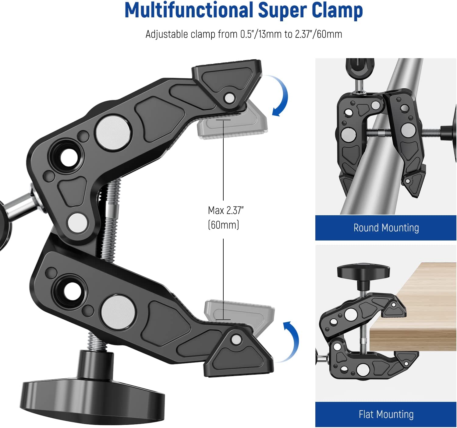• 【ST80 Multifunctional Super Clamp】 The super clamp can grip objects 0.5" - 2.4" (13 - 60mm) in diameter. To make it applicable to more shapes, the clamp features V grooves and pivot tips, both padded with silicone rubber for increased stability and securing on flat or cylindrical objects like desktops, tripods, shoulder rigs, and bicycle handlebars. Also compatible with DJI Ronin-M Ronin MX & Freefly Movi 25mm and 30mm rods