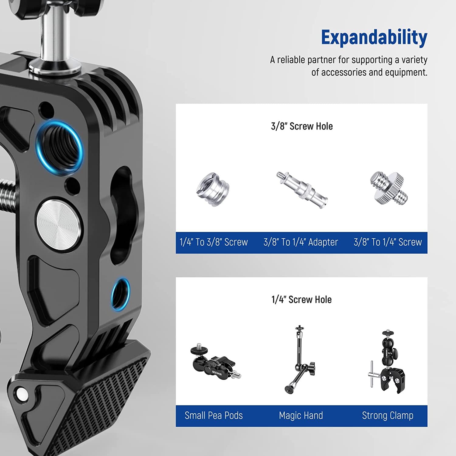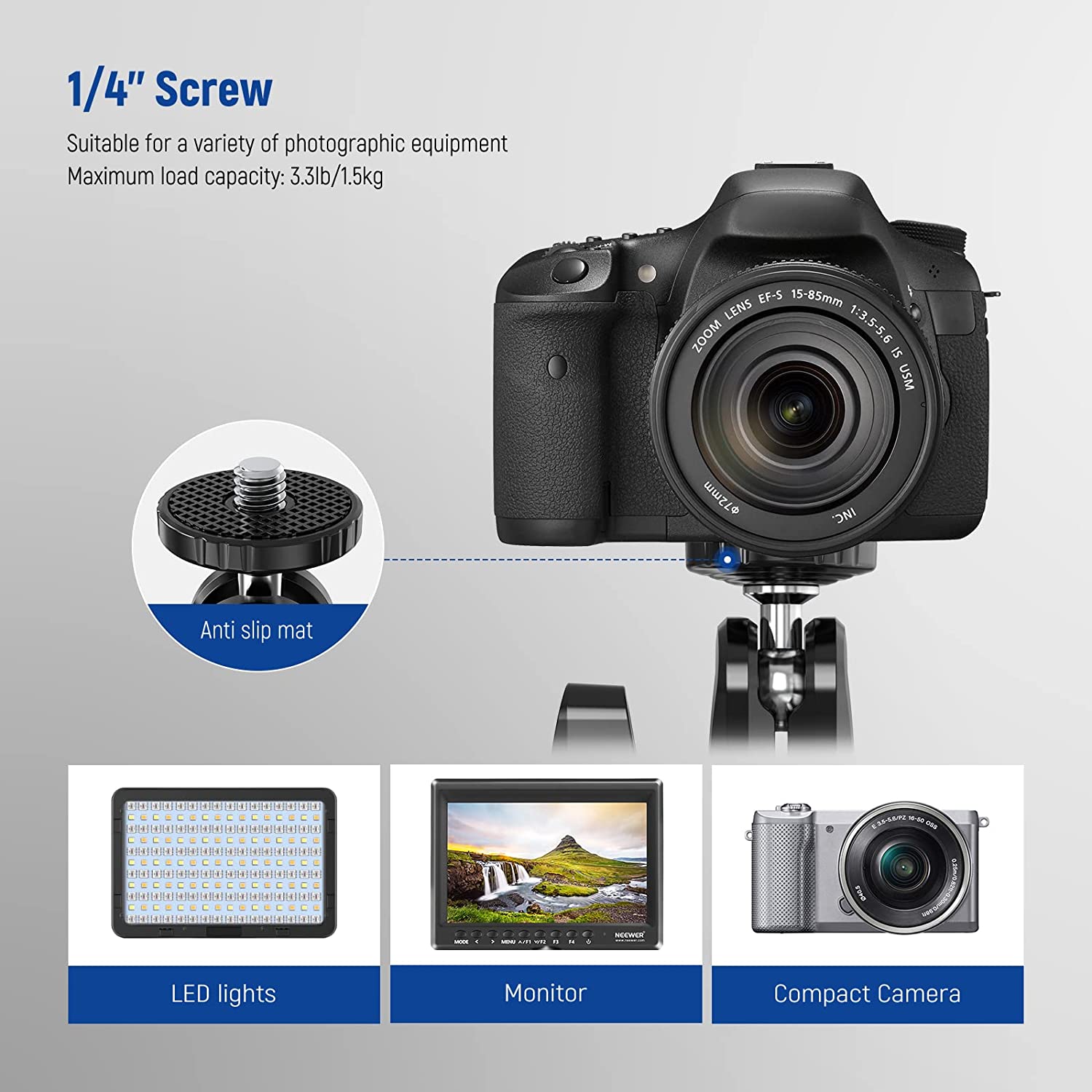 • 【Standard 1/4" & 3/8" Threads】 The standard 1/4" mounting screw can support various photographic equipment, including vlog cameras, mirrorless cameras, action cameras, camera field monitors, speedlites, microphones and LED lights that weigh no more than 3.3lb (1.5kg). Multiple 1/4" and 3/8" mounting points also allow for adding more additional accessories.