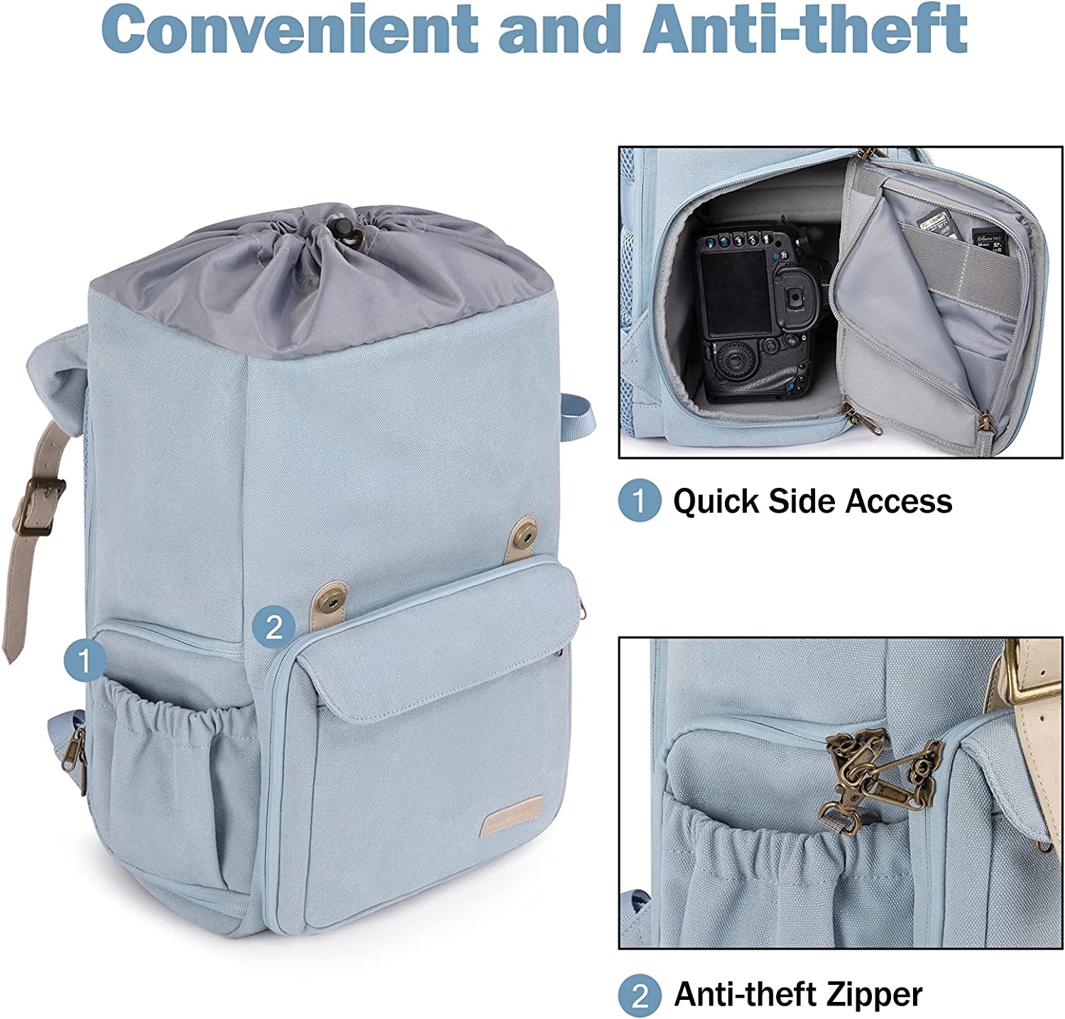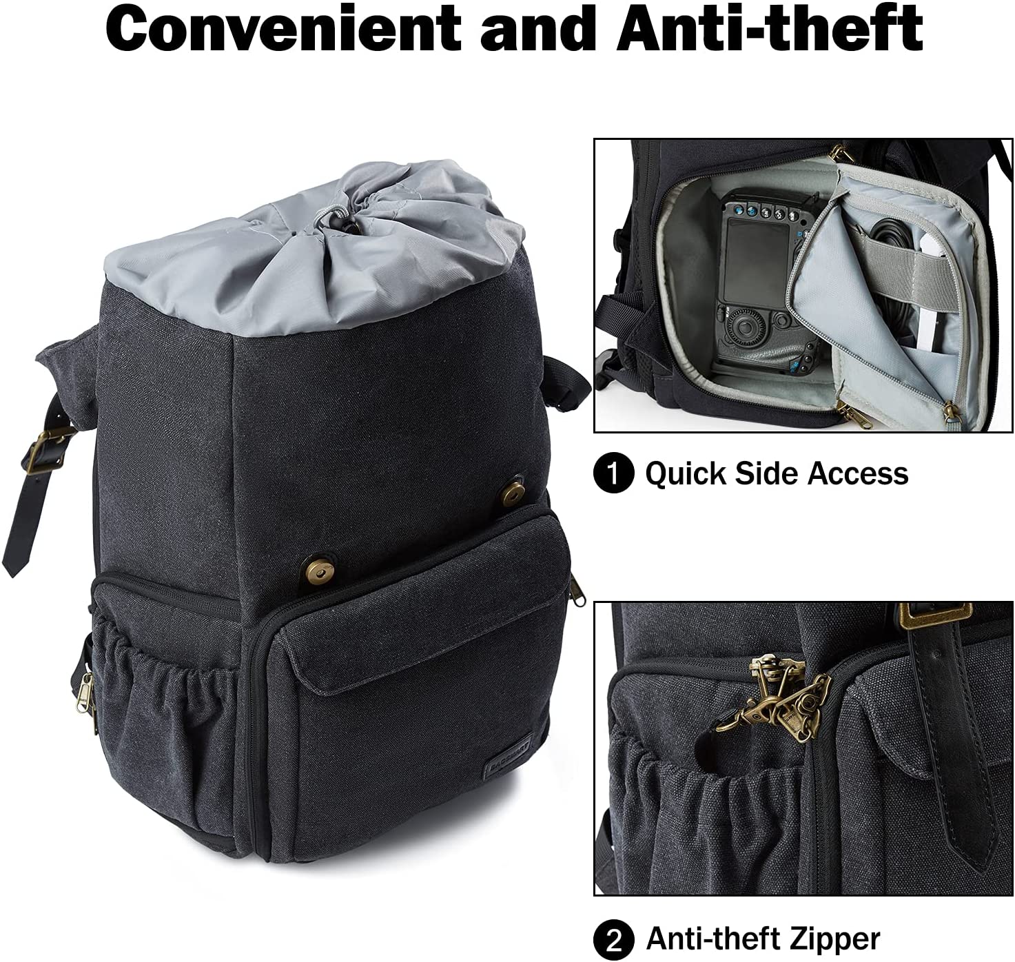 • Keep Camera Safe- Waterproof: made of durable and waterproof canvas, includes a rain cover. Anti-theft: lockable zippers and a high-quality metal hook can achieve the purpose of anti-theft.
