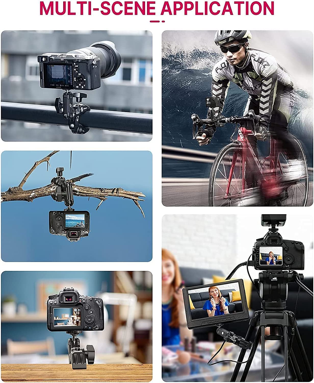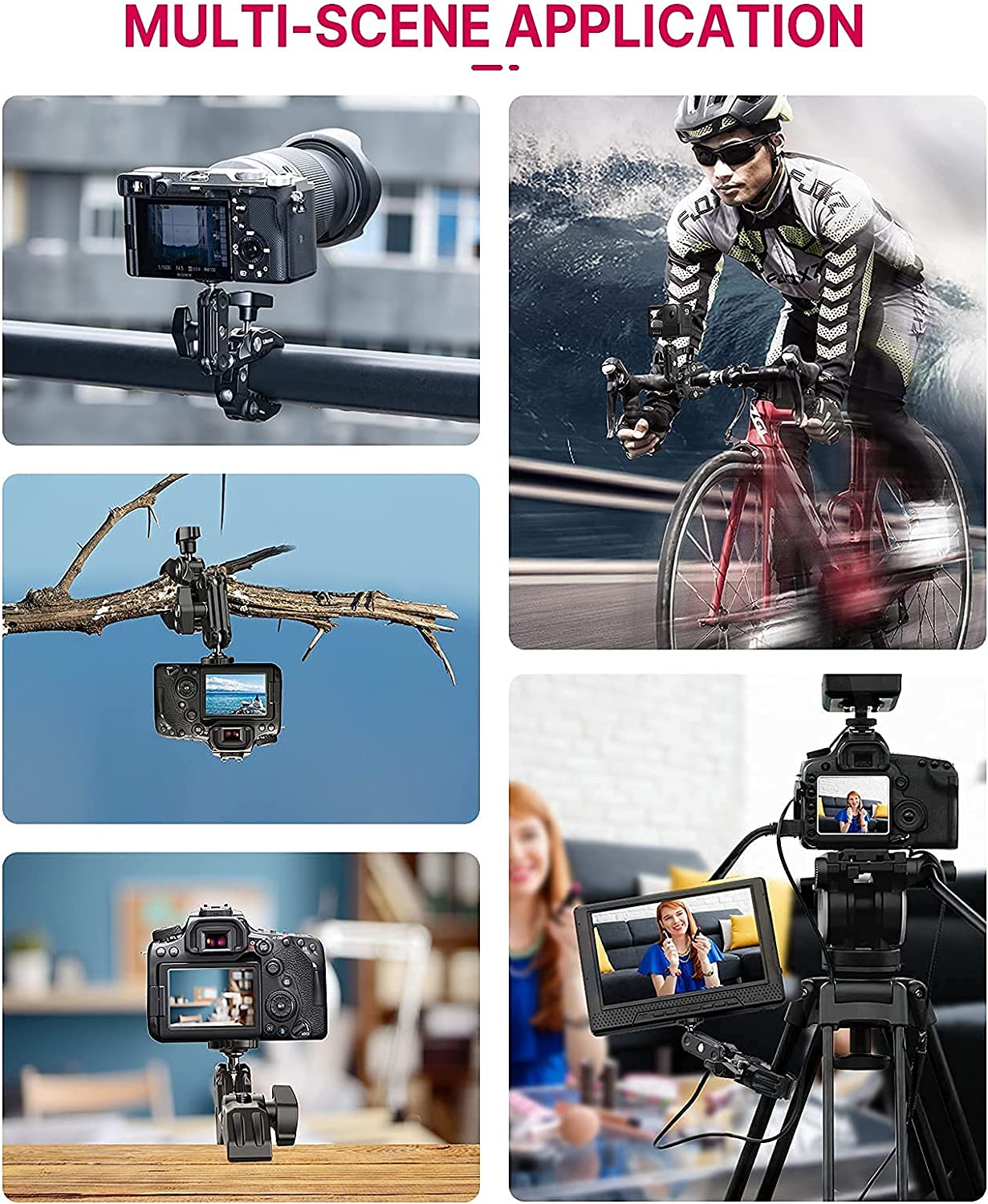 • Standard 1/4” and 3/8” female thread: 1/4” and 3/8” female thread on the back-side of clamp help you to mount a small camera, monitor, LED video light, microphone, speedlite, and more. Come with a gopro adapter, it is also compatible for gopro.