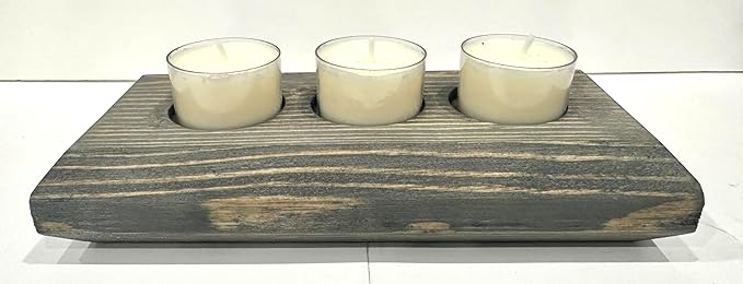 8 Inch - 3 Tea Light Candle Holder - Modern Contemprary Profile Silhoutte (Aged Barrel Gray Stained Wood)