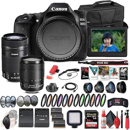 Canon EOS 80D DSLR Camera with 18-135mm Lens (1263C006) + EF-S 55-250mm Lens + 64GB Memory Card + Case + Corel Photo Software + 2 x LPE6 Battery + External Charger + Card Reader + More (Renewed)