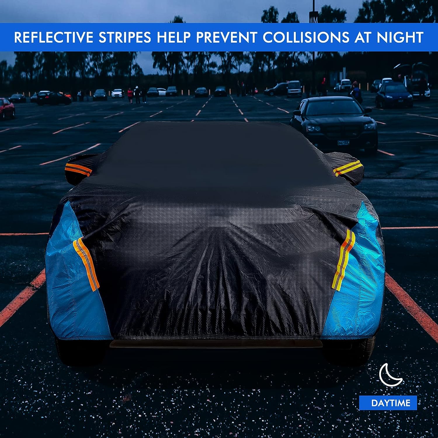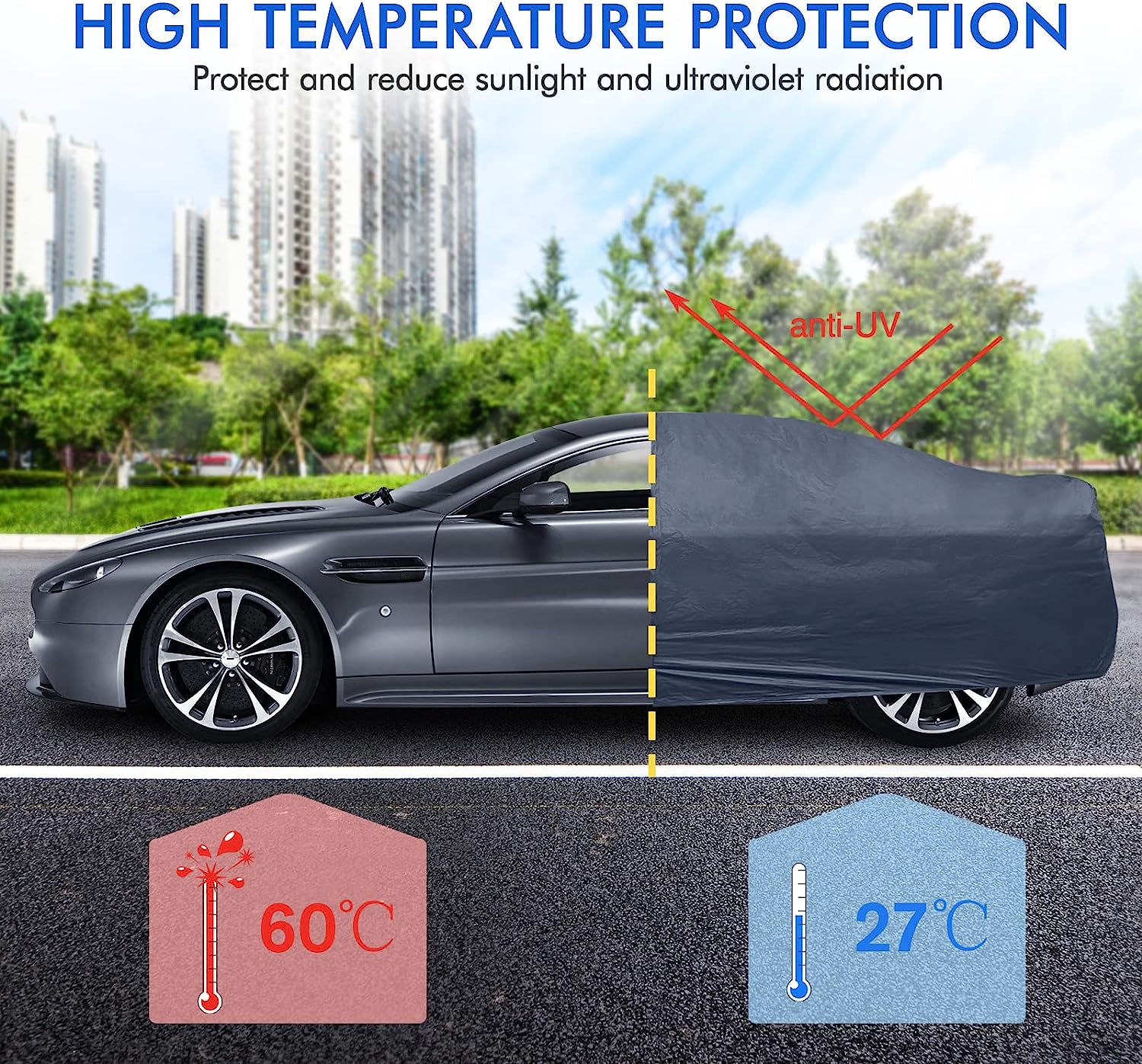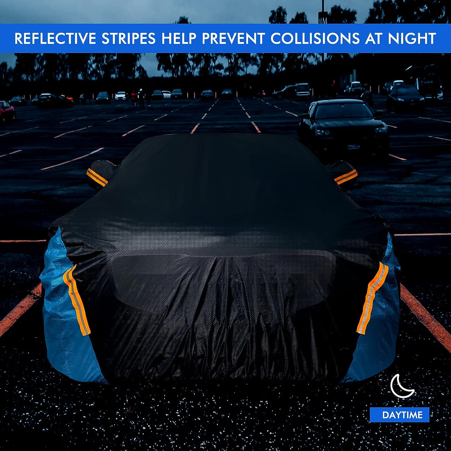 • 🚗 【All-weather Protection】 The car cover can prevent wind, dust, sunlight, rain, snow, and hail. Whether in midsummer or winter; Whether in hot summer or rainy and snowy weather, the all-weather waterproof car cover can protect your car all year round. With wind rope, the car cover can completely cover and stick to the car body to avoid being easily blown away by the wind; The reflective strip is designed for night remind to prevent a collision